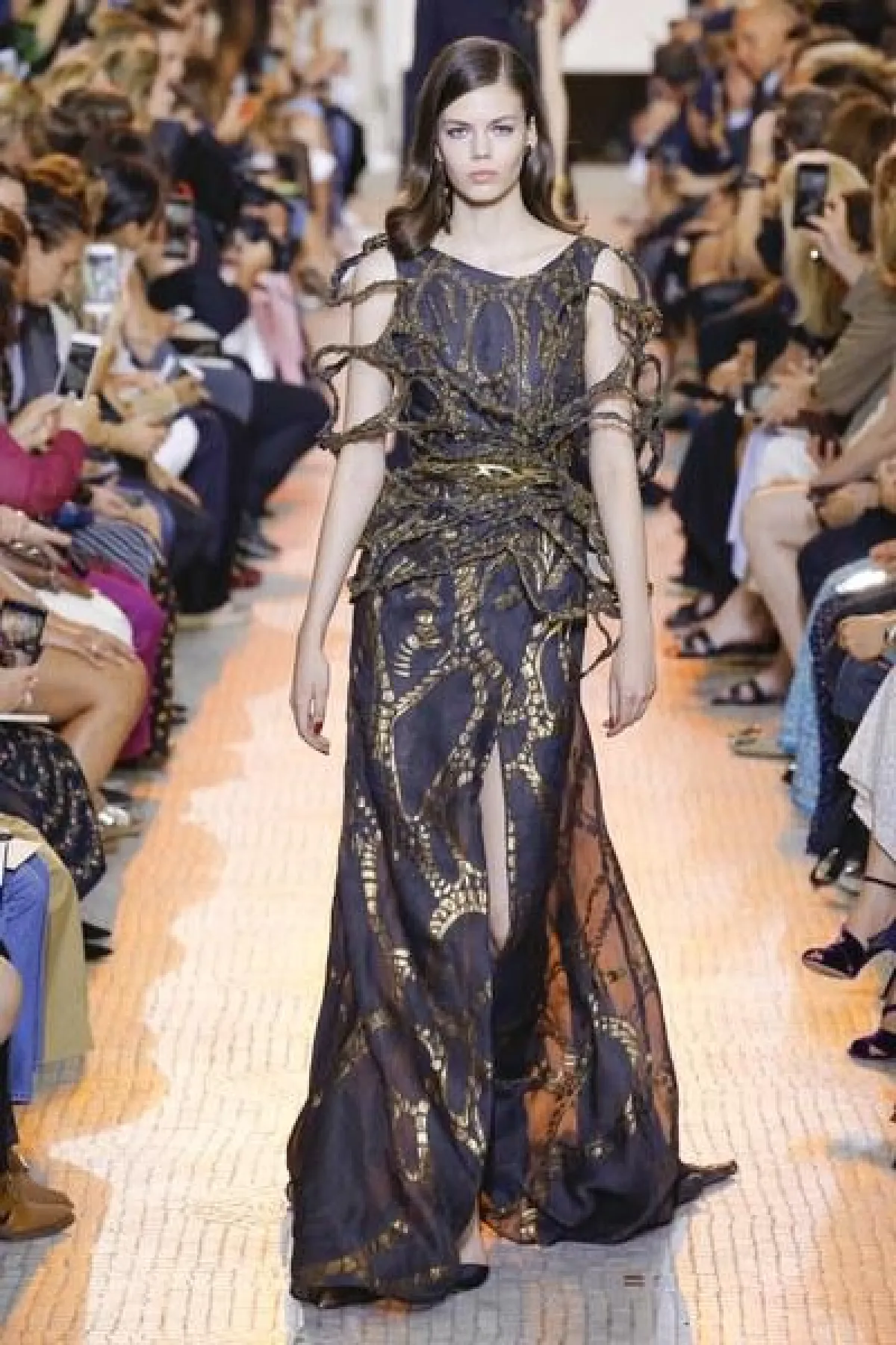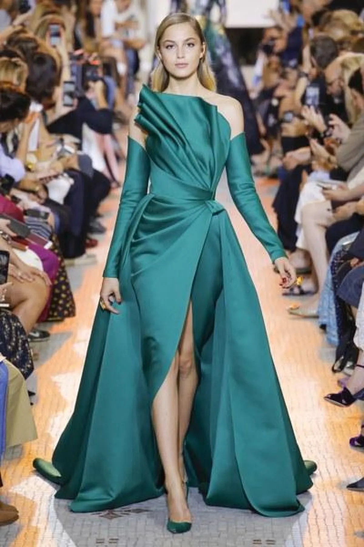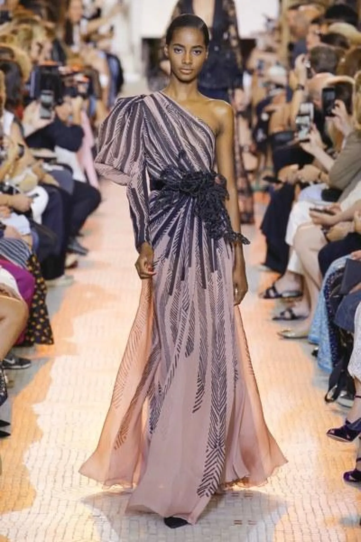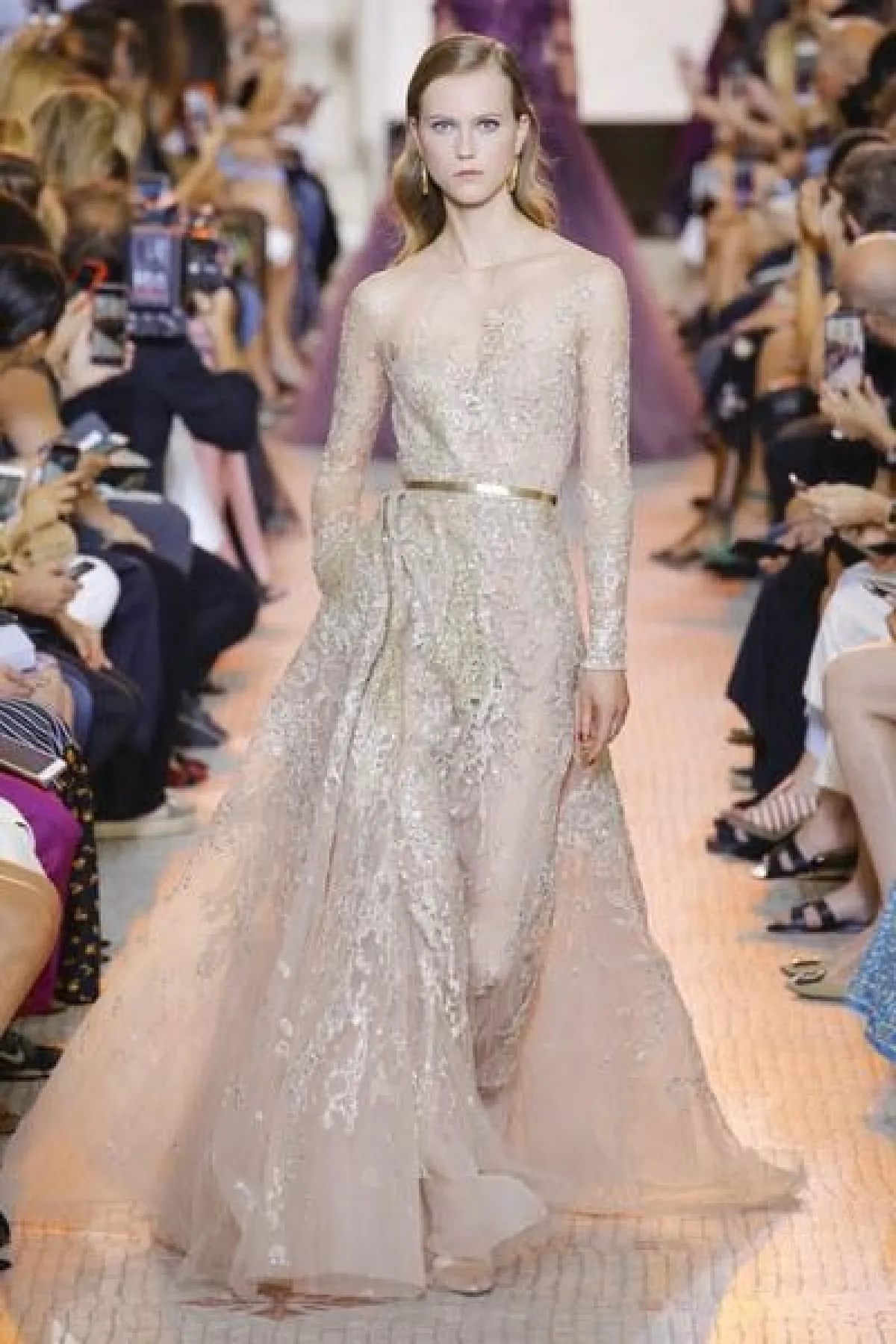 مجموعة "الكوتور" التي قدّمها إيلي صعب في 2018، تقوم على تناسق الألوان المحايدة مع نغمات الأحجار الكريمة.