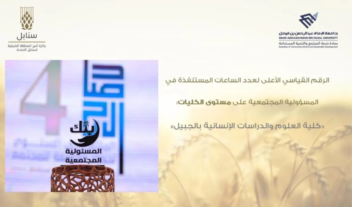 سجلت كلية العلوم والدراسات الإنسانية في جامعة الإمام عبد الرحمن الفيصل في الجبيل الرقم القياسي لعدد الساعات المستنفذة في المسؤولية المجتمعية، على مستوى الكليات بالجامعة، محققة بذلك المركز الأول.