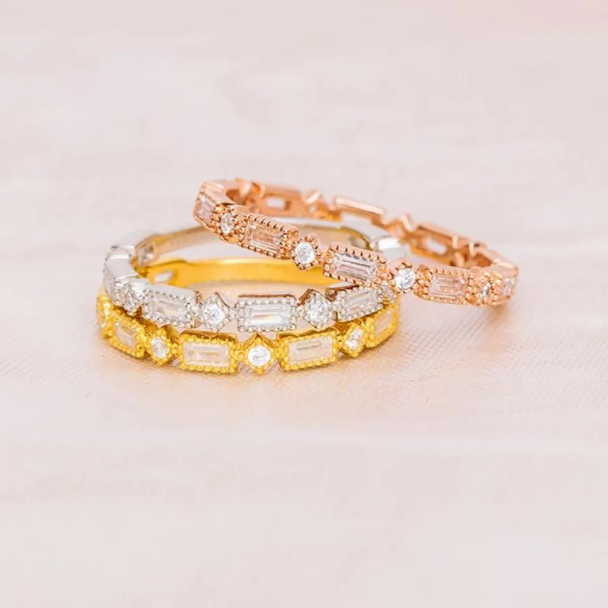 إذا كنتِ تميلين إلى كل ألوان دبل الخطوبة، يمكنكِ اعتماد كل الدرجات بدبلة واحدة طبقية، تجمع بين الفضي والذهبي والروز الذهبي لاطلالة مخملية وفخمة، تزيّنين بها يديكِ.