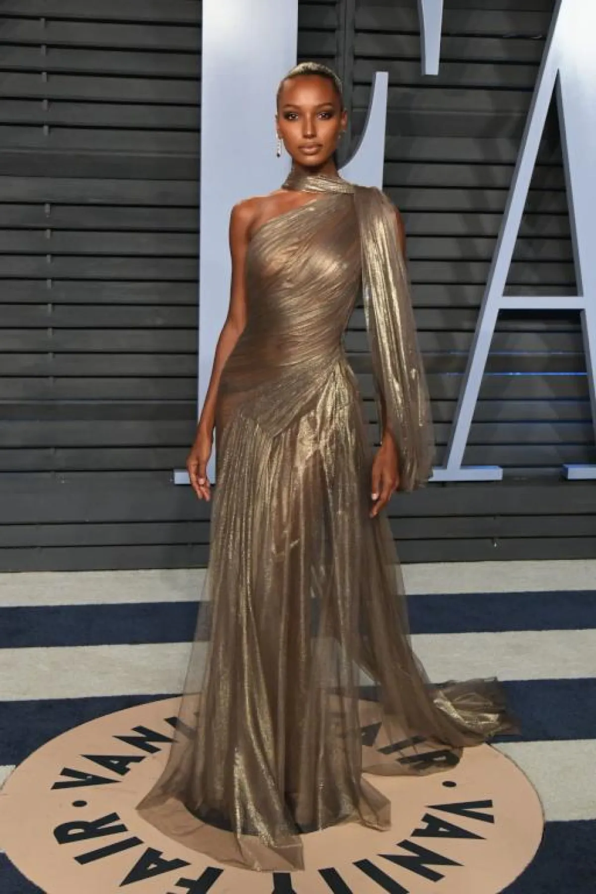 Jasmine Tookes في فستان ذهبي من Jean louis sabaji