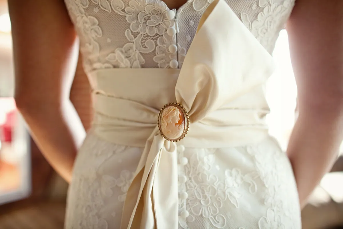 إذا كان فستان زفافك بتصميم ناعم وبسيط، فلم لا تضيفي له لمسة فاخرة بالبروش الماسي، حيث إن الدبابيس البرّاقة عادت من جديد لتسيطر على صيحات الموضة.