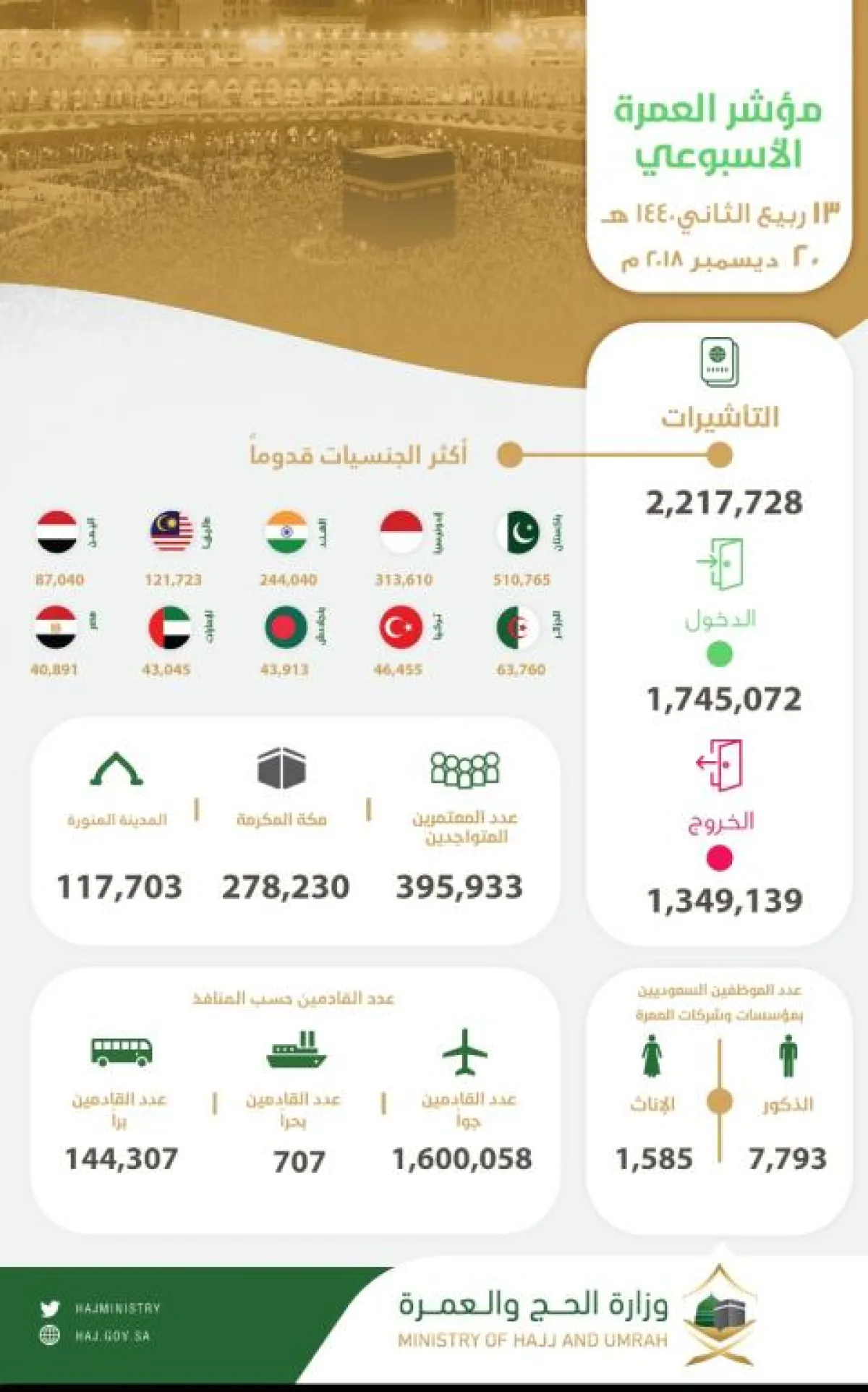 وبحسب المؤشر الأسبوعي للعمرة، فقد جاء مجموع القادمين إلى المملكة 72,745,1 معتمر، في حين بلغ عدد المعتمرين المتواجدين داخل المملكة 933,395 معتمراً، منهم 230,278 في مكة المكرمة، بينما يتواجد 703,117 في المدينة المنورة، فيما سجلت مغادرة 139,349,1 معتمر بعد أن أدّوا العمرة والزيارة.