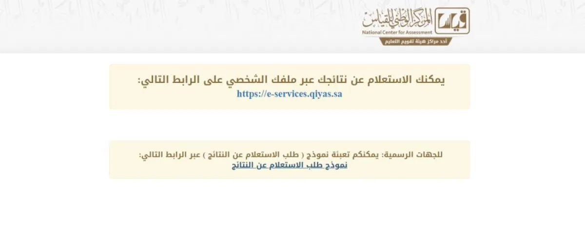 وكان المركز الوطني للقياس قد ألغى صفحة البحث عن نتائج الاختبارات برقم الهوية فقط، كما كان عليه الحال في السابق، حفاظاً على الخصوصية، وبدلاً من ذلك، يمكنك الاستعلام عن نتائج الاختبارات التي أجريتها في المركز بالدخول إلى ملف حسابك الشخصي في موقع المركز، أو الاتصال بالهاتف الموحد 920033555، كما يمكن إرسال نتيجة الاختبار برسالة إلى جوالك.