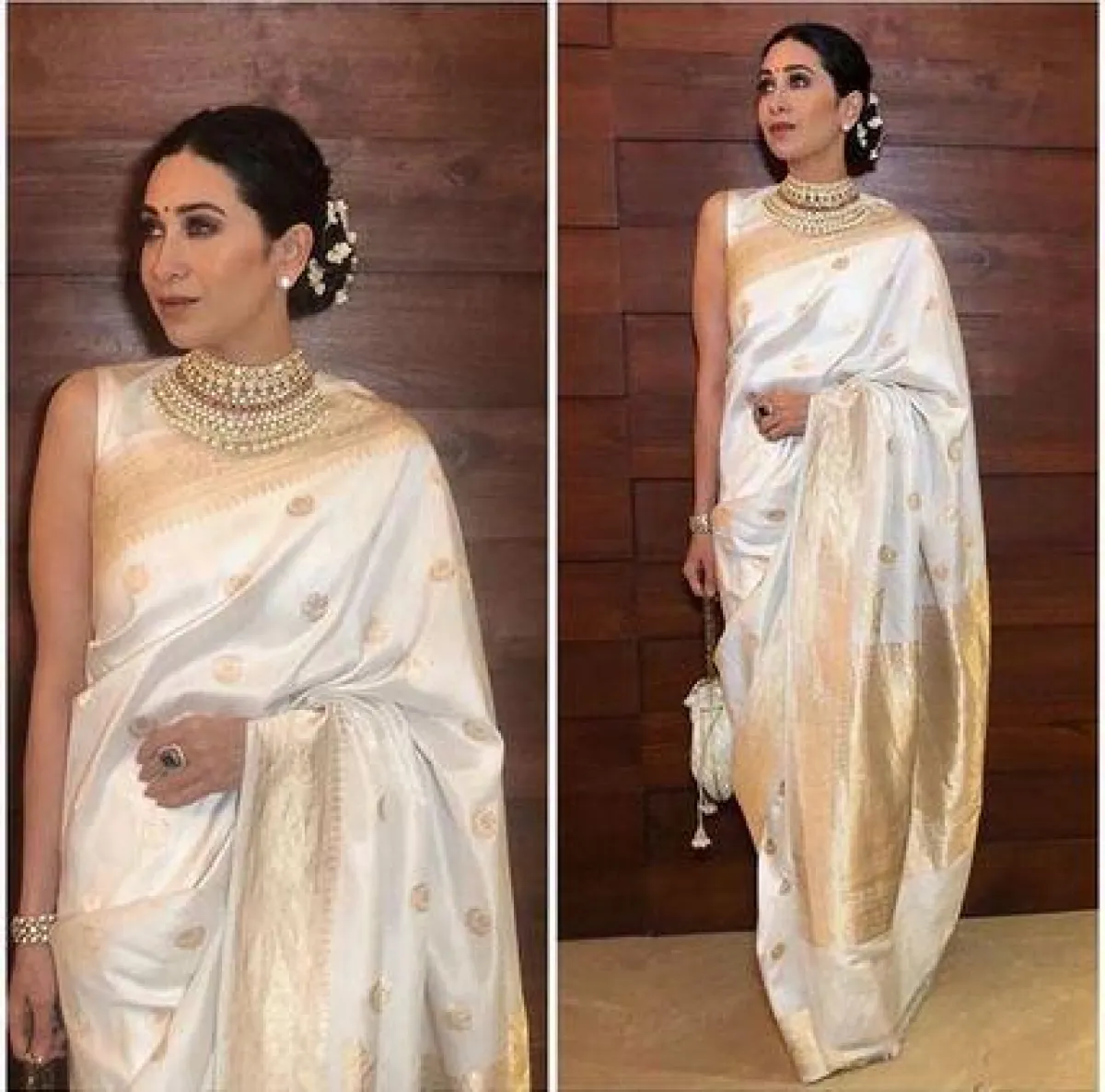 يمكنكِ اعتماد الساري الهندي من الستان الحريري الناعم بدرحة الأوف وايت، إن كنتِ تبحثين عن الشكل التقليدي للـ فساتين الهندية، مع رسومات للإطار الذهبي للفستان، ستعتمدين معها بالطبع مجوهرات ذهبية اللون، وقد تختارين رفع شعركِ للوراء، أو عمله على أحد الجانبين.