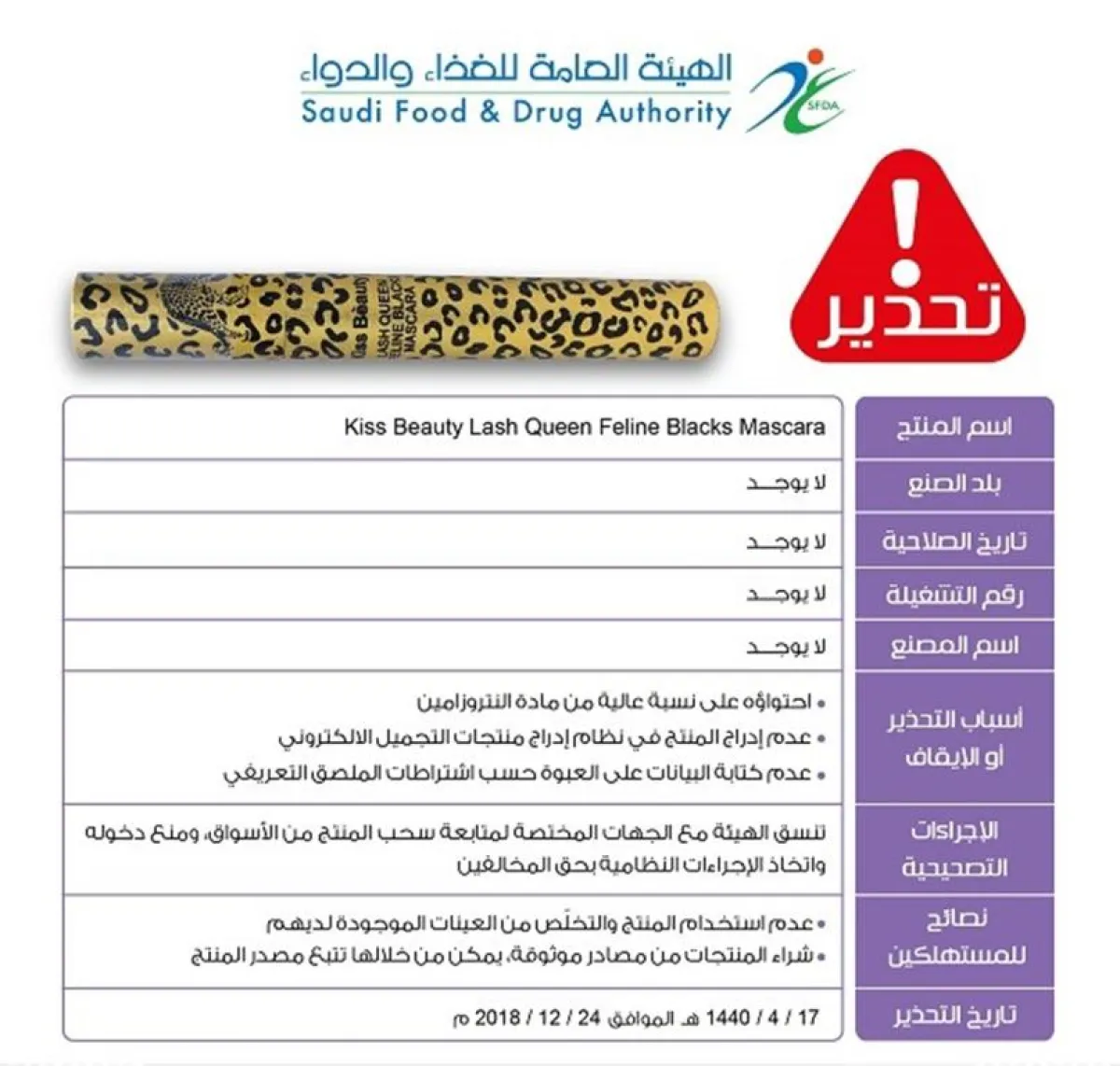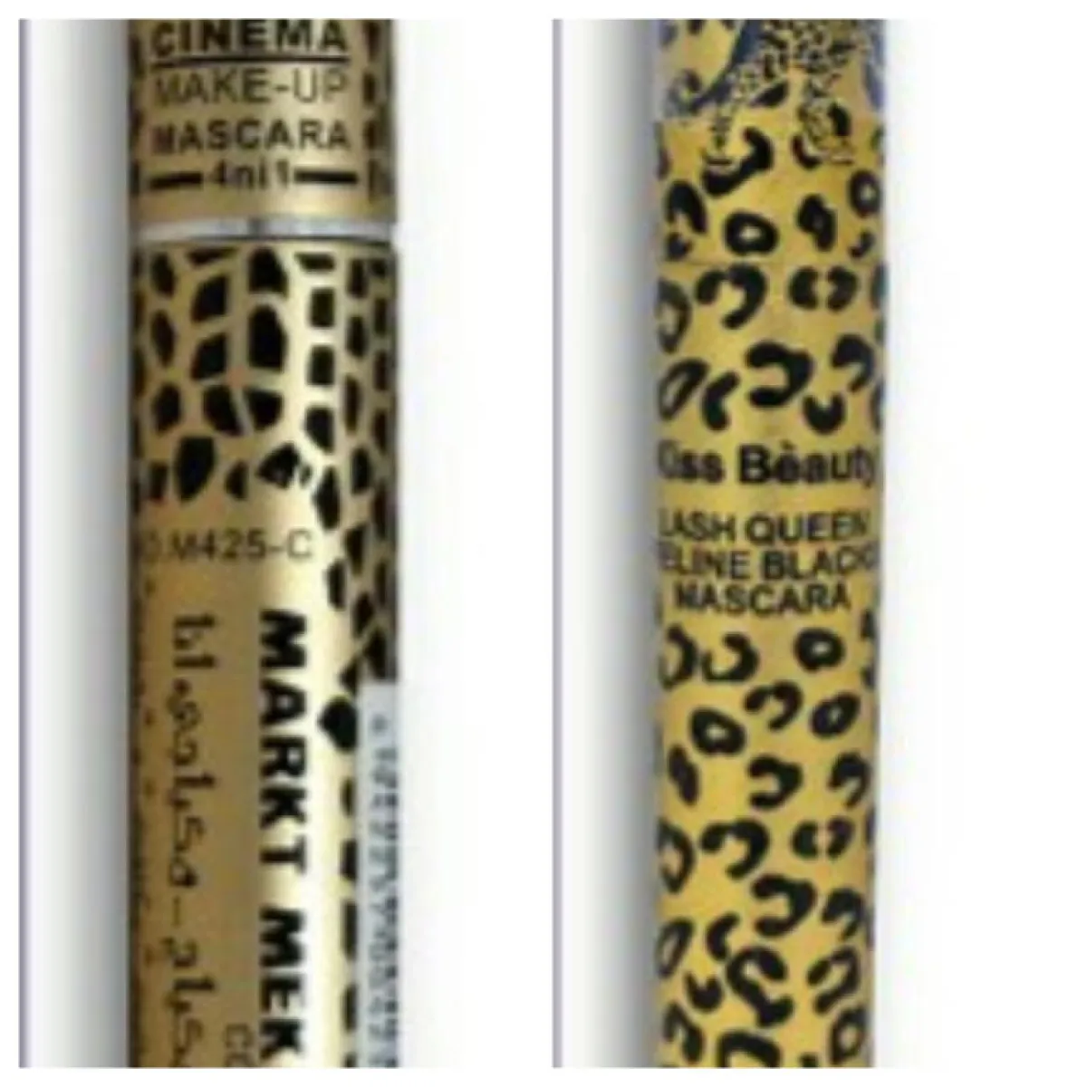 وأضافت، أن المنتج الأول يحمل اسم “Markt Mekyach Cinema Mascara 4 in 1 Black، أما الثاني فهو Kiss Beauty Lash Queen Feline Blacks Mascara، مشيرةً، إلى عدم كتابة البيانات على المنتجين حسب اشتراطات الملصق التعريفي إذ لا يحمل المنتجان تاريخ صلاحية ولا رقم تشغيلة ولم يدون عليهما بلد الصنع ولا اسم المصنع.