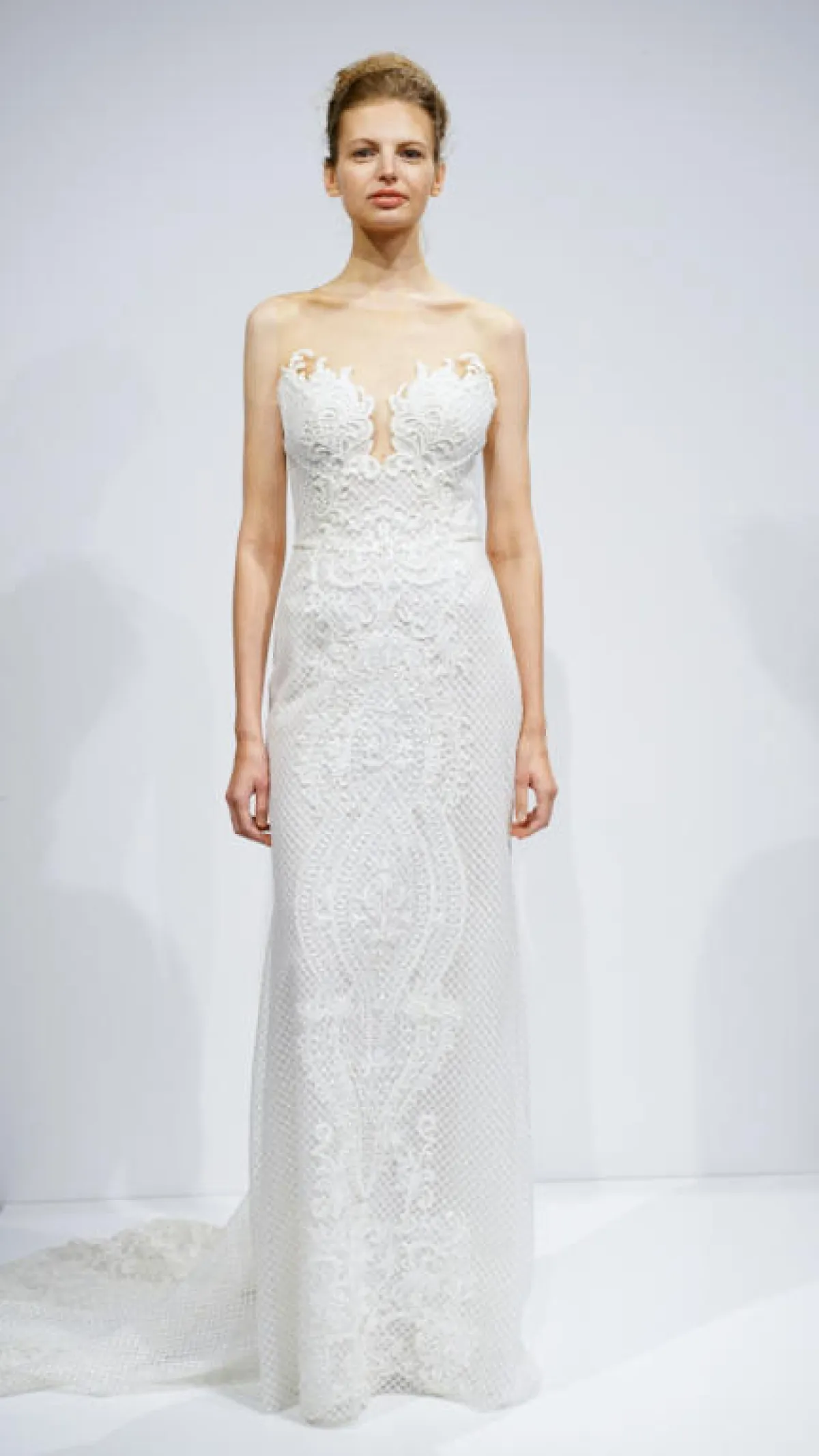 وللـ عروس التي تريد الظهور بقوام أكثر نحافة وطول، ولإخفاء حجم الصدر الكبير، فلتختار فستان بسيطة بقبّة الـV، مثل فساتين مونيك لولييه Monique Lhuillier ورومونا كيفيزا Romona Keveza.