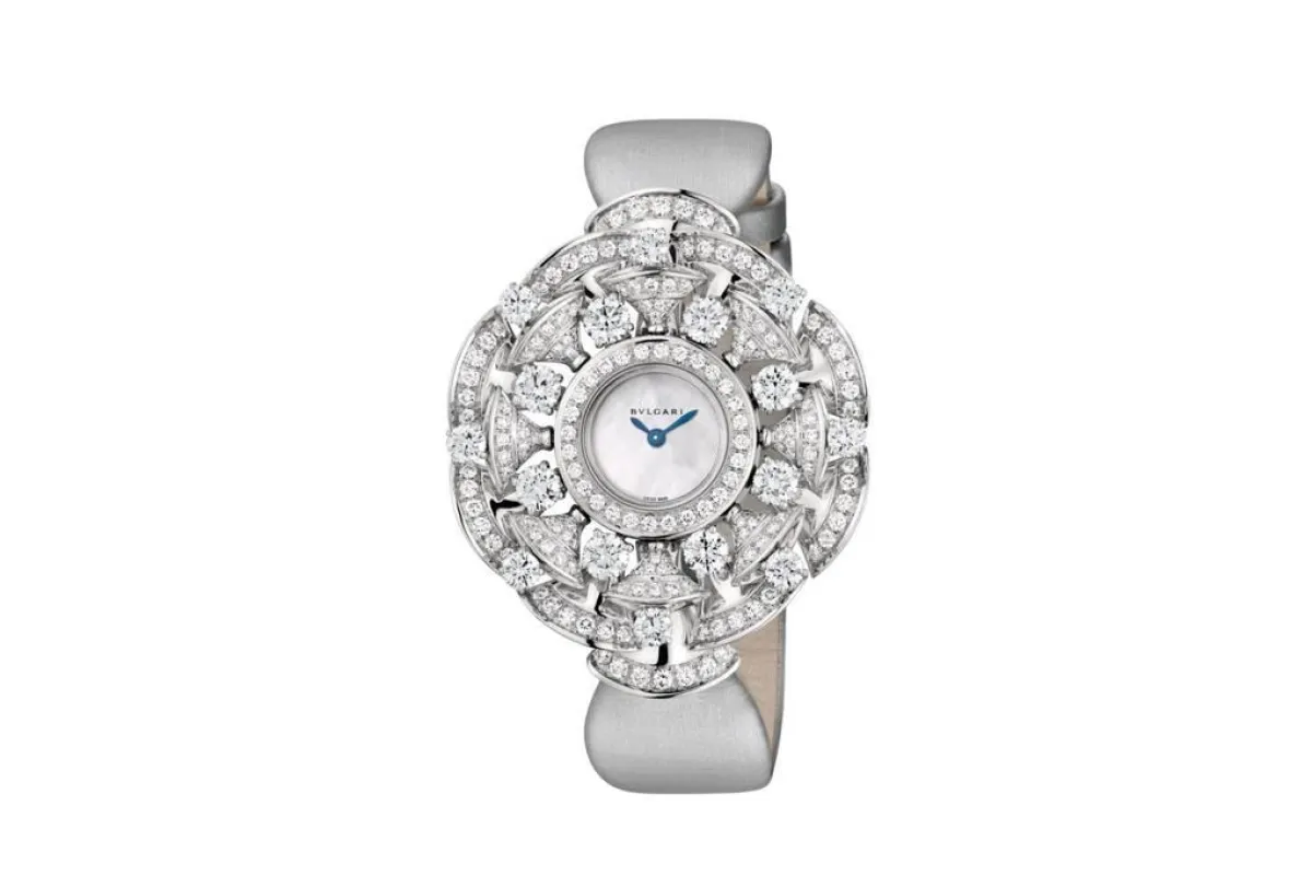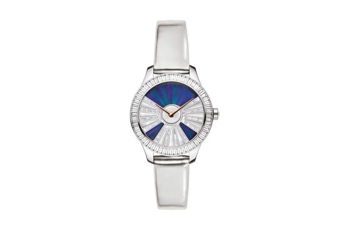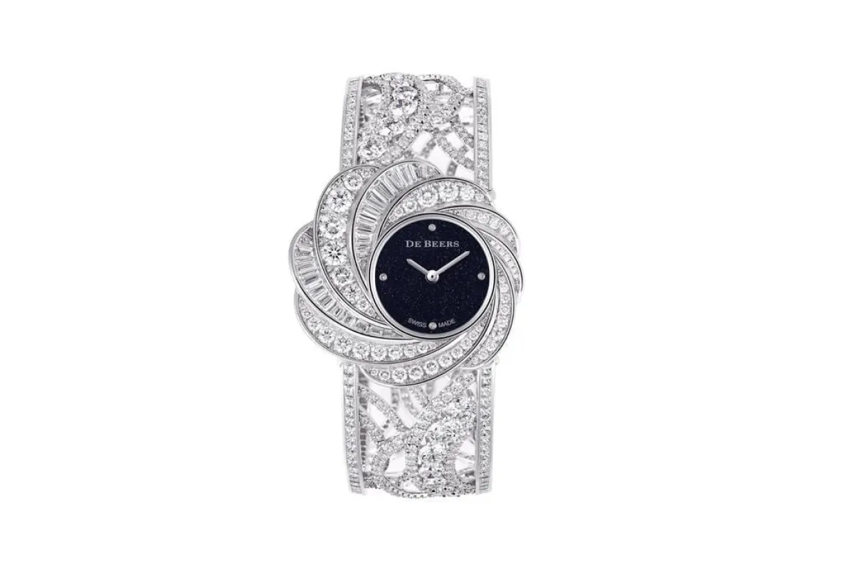 الفستان الفضي المطرز قد يحتاج لساعة مرصعة بالأحجار بالكامل، مع قلب الساعة باللون الأسود ليتماشى مع تاجكِ الفخم، كالموديل من De Beers دي بيرز، والتي تناسب اليد الرفيعة والطويلة.
