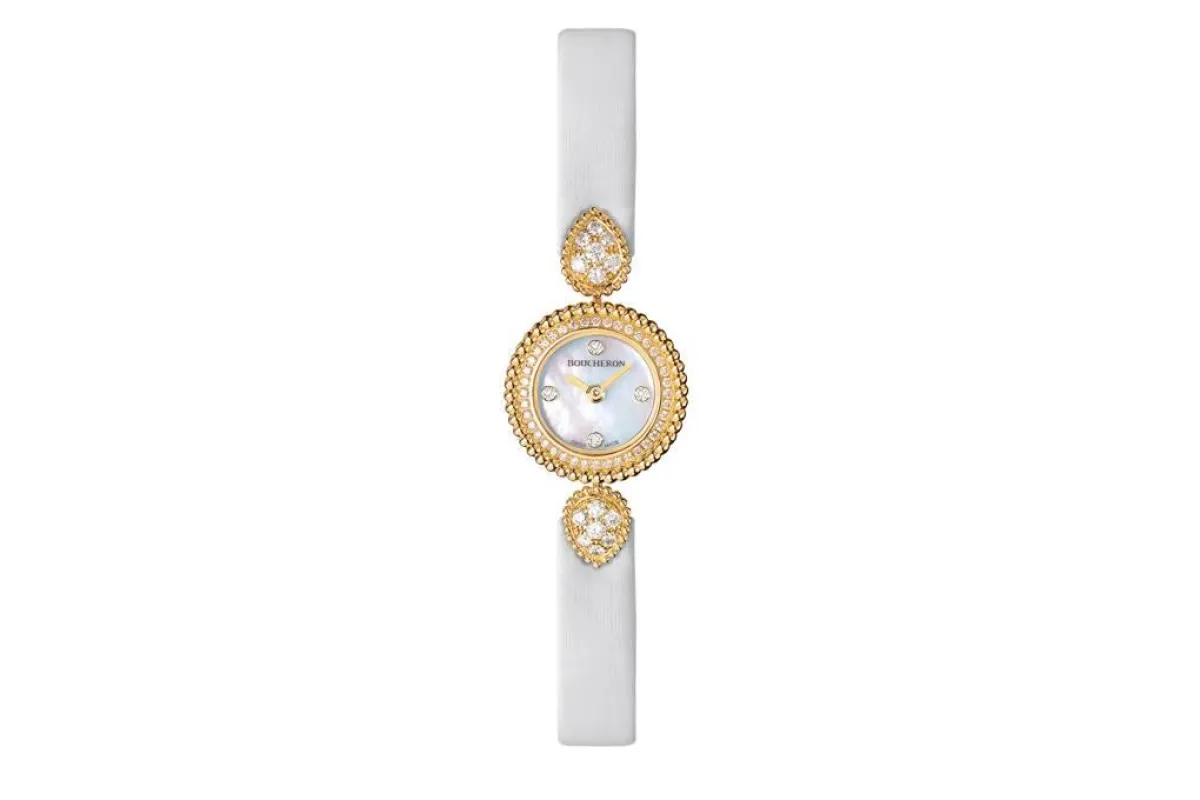 في المقابل لفتتنا الساعة بالمعصم الأبيض من Boucheron بوشيرون، لاطلالة مختلفة وجذابة، ورقيقة أيضًا بالوقت نفسه، للصبيّة التي تبحث عن كل ما هو مختلف، كما أنّ الإطار الذهبي يجعلها تليق بالفساتين البيضاء أو الأوف وايت كذلك.