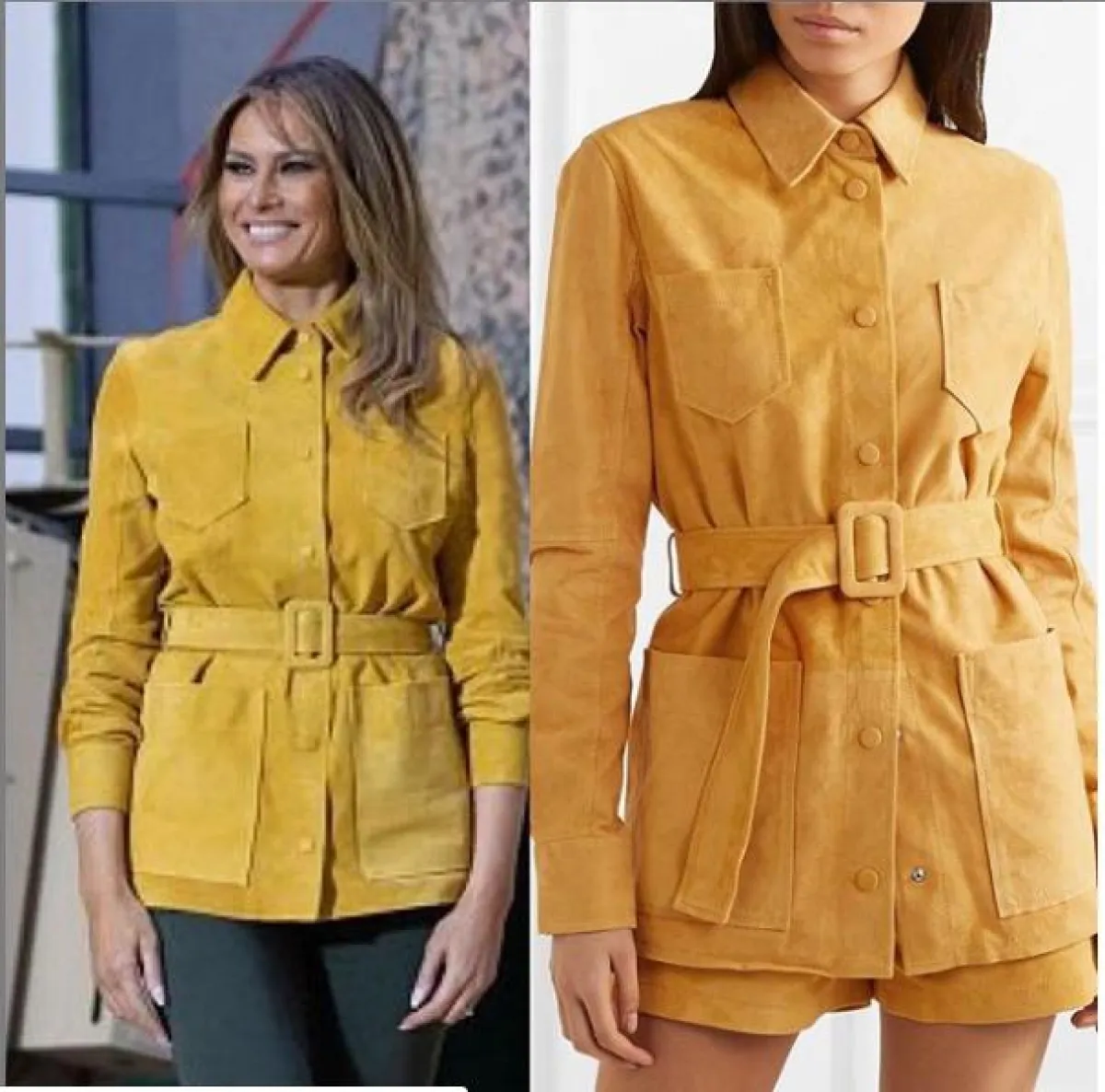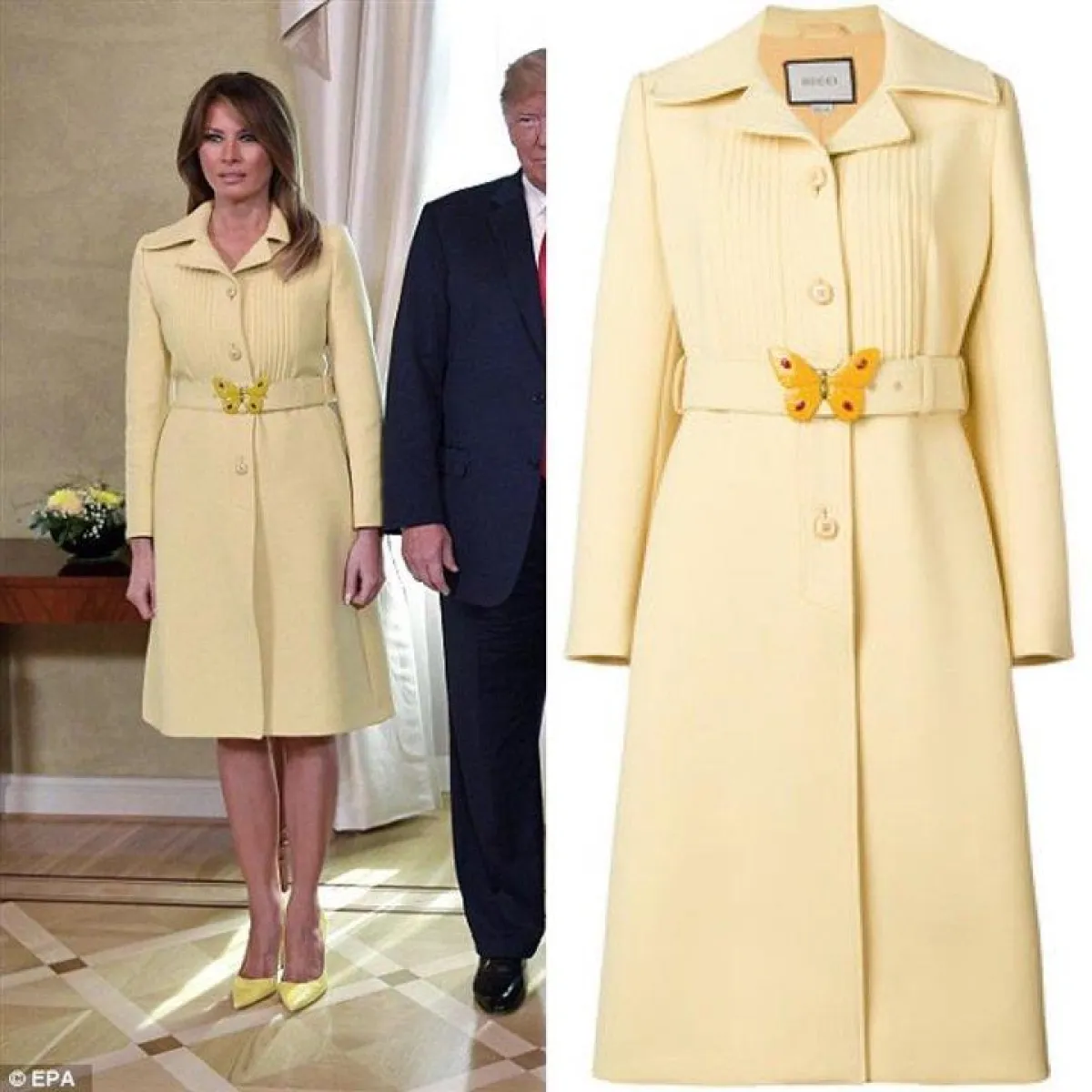 -ظهرت زوجة الرئيس الأمريكي خلال زياراتها لفنلندا، بمعطف طويل باللون الأصفر الباستيل، وتميز المعطف بشكله الحيوي وبأكمام طويلة، كما يتوسطه حزام به فراشة باللون الأصفر الداكن، وارتدت حذاء باللون الأصفر بنفس لون الحزام، وهو ما أعطاها إطلالة جذابة ومتألقة للغاية، وبلغ سعر المعطف 3.700 دولار من ماركة غوتشي.