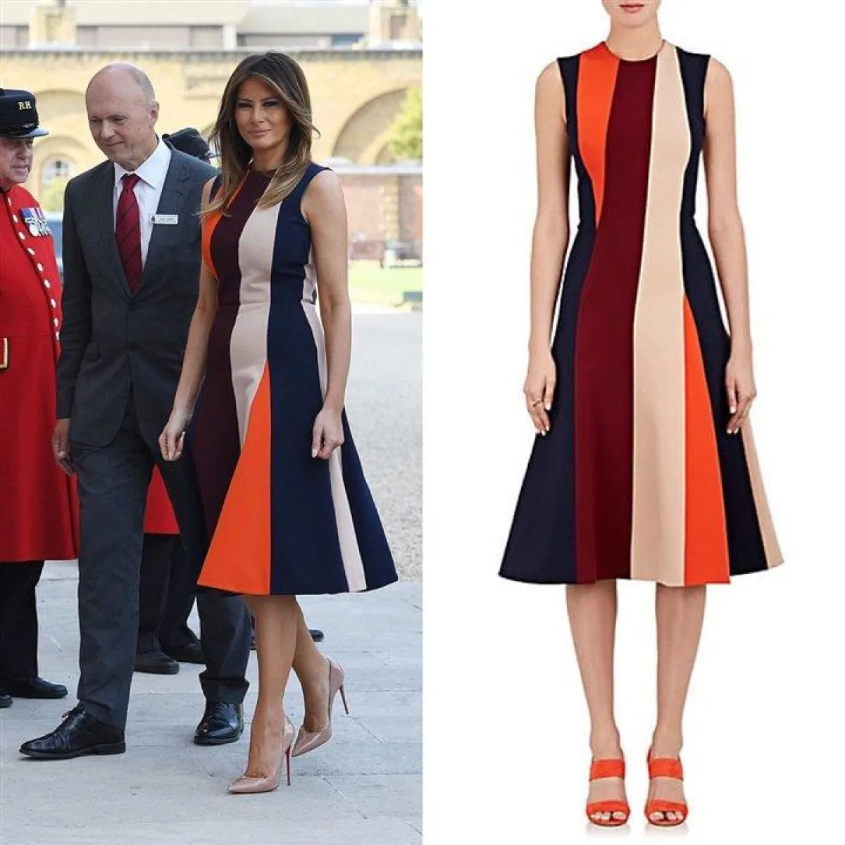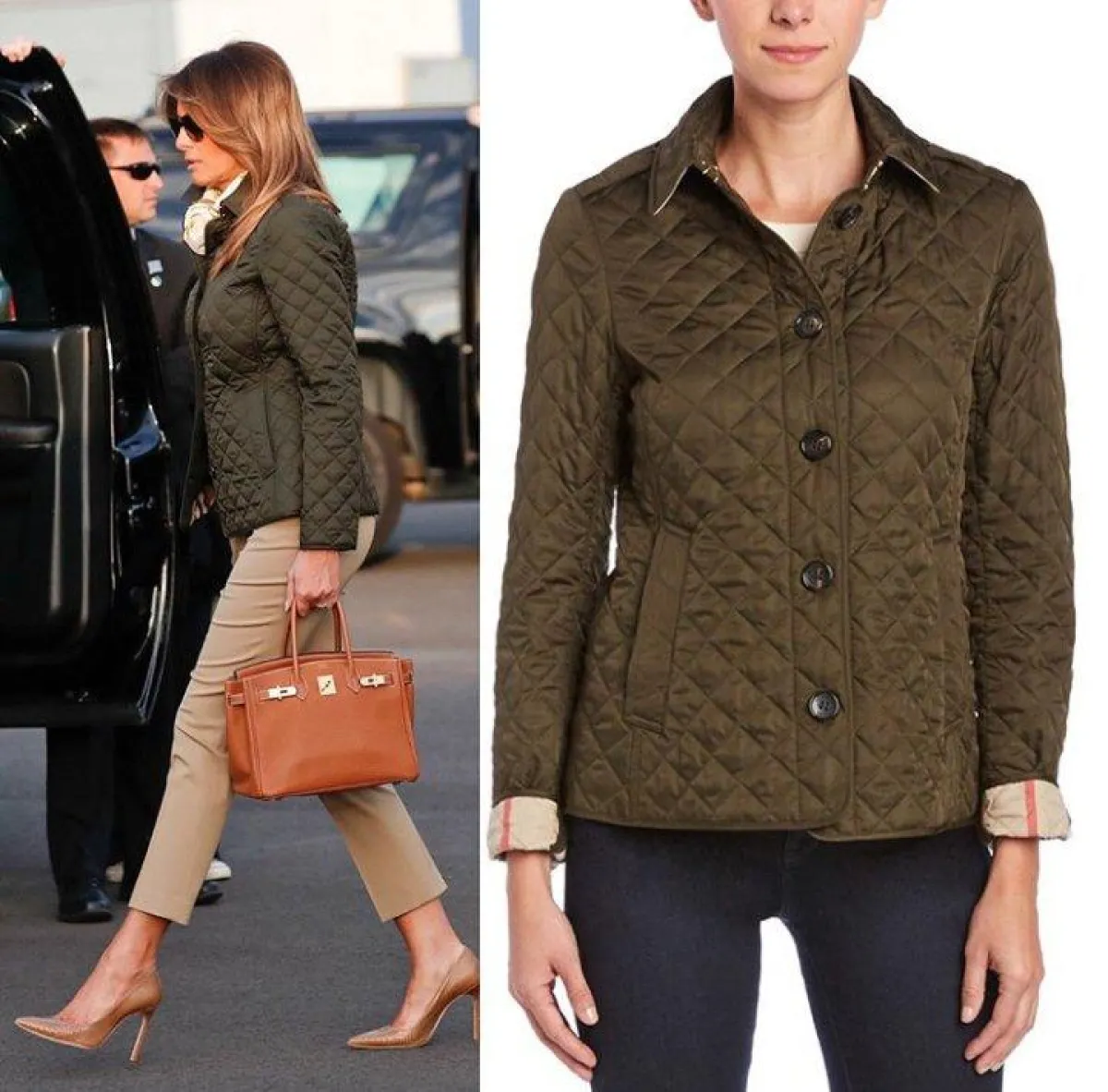 -ارتدت جاكيت باللون الأخضر من ماركة "بربري"، بلغ سعره ٢٩٥ دولاراً أمريكياً، وتناسب معها بشكل كبير، وارتدت تحته بنطالاً باللون البيج الفاتح، يتناسب بشكل كبير مع إطلالتها، وحملت ميلانيا حقيبة باللون البيج، من ماركة "هيرميس" بلغ سعرها ٨.٣٠٠ دولار أمريكي، ونسقت معه حذاء باللون البيج ذات الجلد اللامع من ماركة "ميلانو بلانكيت"، والذى بلغ سعره ١٣٥ دولاراً أمريكياً.
