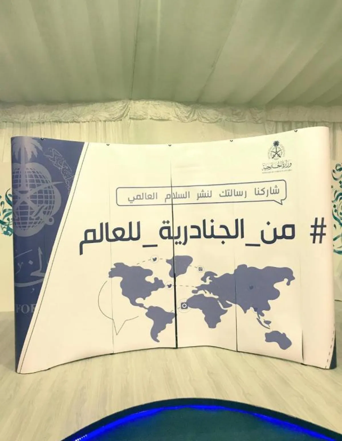 وتهدف المبادرة إلى مشاركة زُوَّار جناح وزارة الخارجية رسالةَ سلام تُعبّر عن منهج الاعتدال والتسامح والحوار، وأهمية تعدد الثقافات ونشر ثقافة التعايش بين الشعوب، وتحقيق السلام بين الدول، ومحاربة التطرُّف والإرهاب، ونشرها عبر منصة التواصل الاجتماعي "تويتر"، حيث تضمنت المبادرة إطلاق وسم #من_الجنادرية_للعالم.