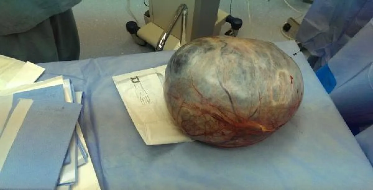 حيث كانت المريضة تراجع المستشفى إثر آلام شعرت بها، وعند الكشف عليها وجد أنها تعاني من انتفاخ كبير في البطن، إضافة إلى مشاكل في الجهاز التناسلي؛ فتم عمل الأشعة والفحوصات اللازمة، وتبيّن أنّ لديها ورمًا كبيرًا على المبيض الأيمن، ومن ثم تم تحضير المريضة، وأُجريت لها عملية جراحية لاستئصال الورم الذي بلغ حجمه الخارجي 24x30 سم، ووزنه 10 كيلو و150 جرامًا وذلك برئاسة استشاري النساء والولادة الدكتور سلطان بغدادين ومساعده الدكتور ماهر خليفة.