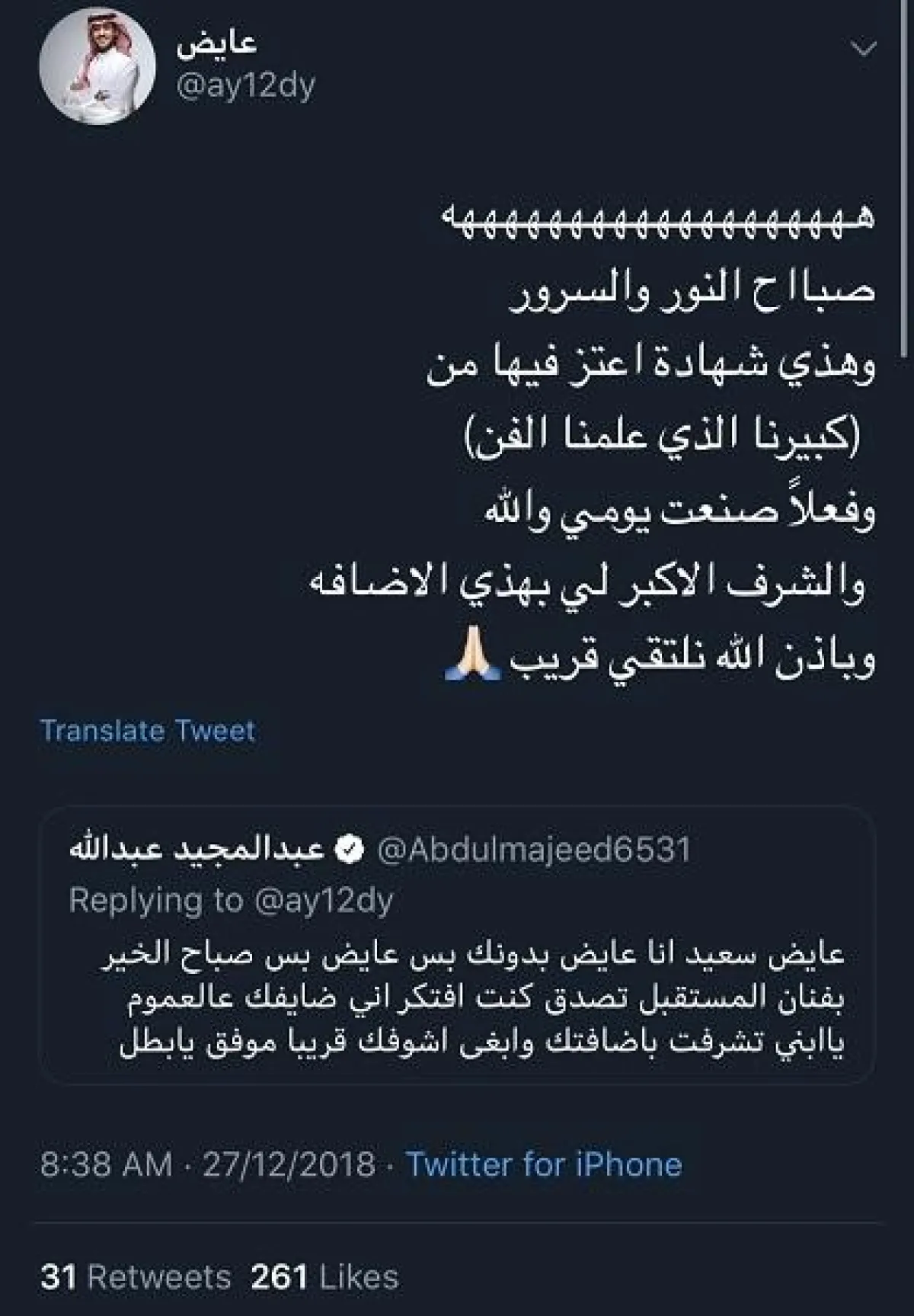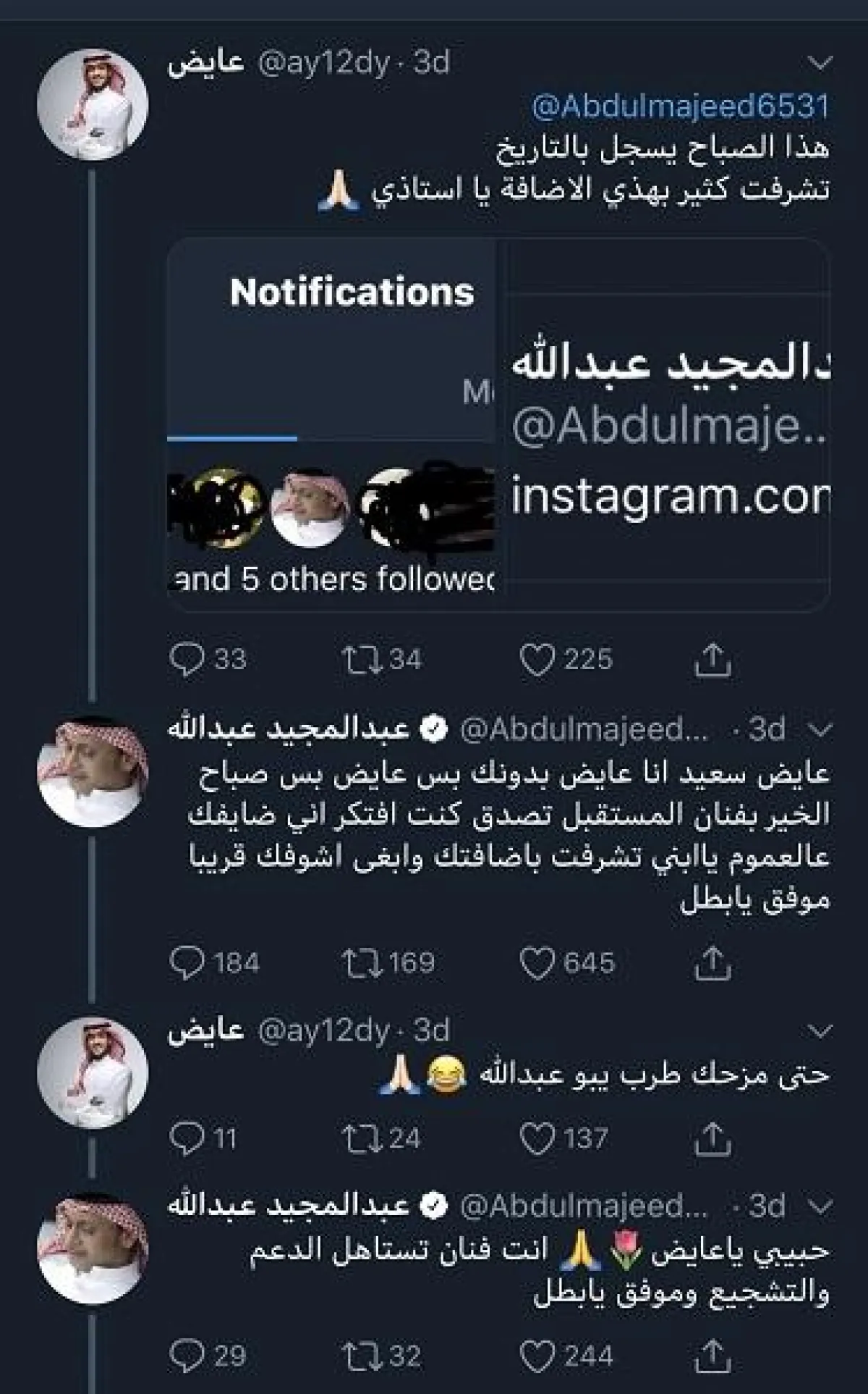 وفي ظل تفاعل المشاهير على مواقع التواصل الاجتماعي ودعمهم للفنانين الصغار، "تابع" الفنان عبد المجيد عبد الله الفنانَ الصاعد "عايض" على منصة "تويتر" الشهيرة، وبعد محادثة عامة ظريفة نتجت بينهما وعدَه برؤيته قريبًا، إلى جانب وصفه بـ"فنان المستقبل"، وسرعان ما قُبلت دعوته، مما أثار حماس متابعيهما، وتزايدت التعليقات ليتوقعَ الجمهور وجود "دويتو" طربي يجمع الفنانين الأكثر جماهيرية في السعودية على الأقل؛ كون نمط الأغاني والأصوات متشابهة؛ للدرجة التي كان يعتقد فيها البعض أن الفنان عايض هو عبد المجيد عبد الله!.