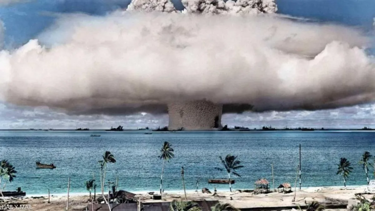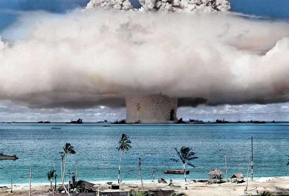 التقطت هذه الصورة لتكون من أوائل الصور لتجربة تفجير نووي عُرفت باسم «ذي بايكر»، وتعرف هذه التجربة النووية أيضاً باسم «حلقية بيكيني»، التي أجرتها الولايات المتحدة الأمريكية في جزيرة «بيكيني أتول» ضمن جزر «مارشال» وسط المحيط الهادئ عام 1946.