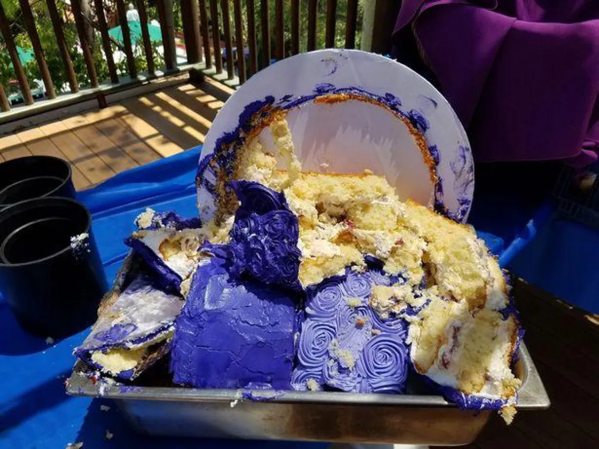 أما عن العروسان فقد قررا الإستمتاع بباقى الزفاف على الرغم من تناثر قطع الكعك والمشروبات على فستان العروس، وقاما بتقطيع الدوناتس بدلا من كعكة الزفاف التي تدمرت.