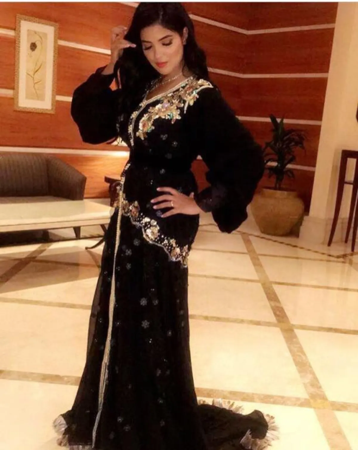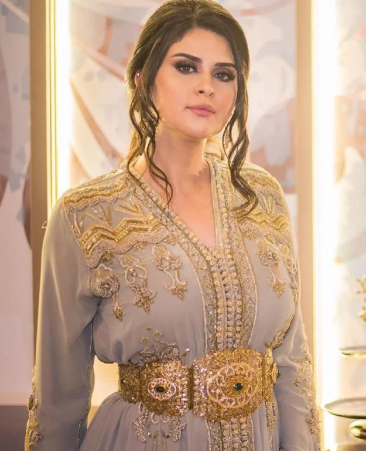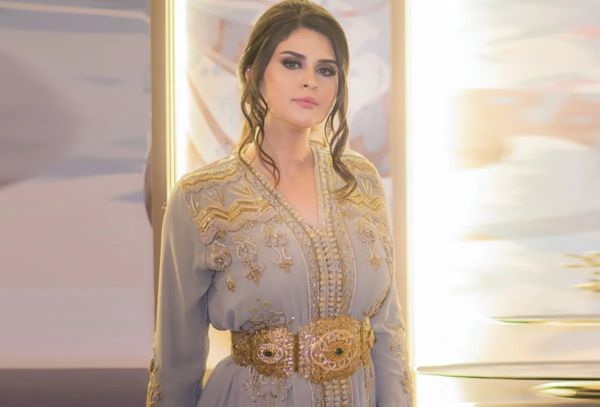 في المقابل اعتمدت الفنانة سلمى رشيد عباية مخملية أنيقة، مطرزة بالكامل بالخيوط الذهبية المتناغمة مع لون النود البيج للعباية، المناسبة أكثر للحفلات الفخمة.