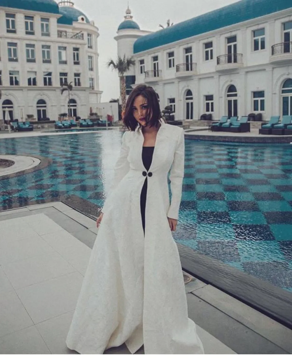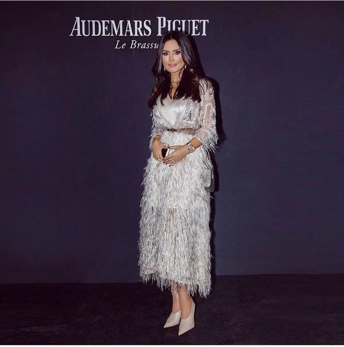 بأسلوب مترف وأنيق اعتمدت بسمة بوسيل عباية مفتوحة مع زر من الخصر ضيّق، لاطلالة كلاسيكية وجاذبة بـ اللون الأبيض، تناسب سهرات الليل، مع كعب مخملي مدبب لاطلالة نحيفة.