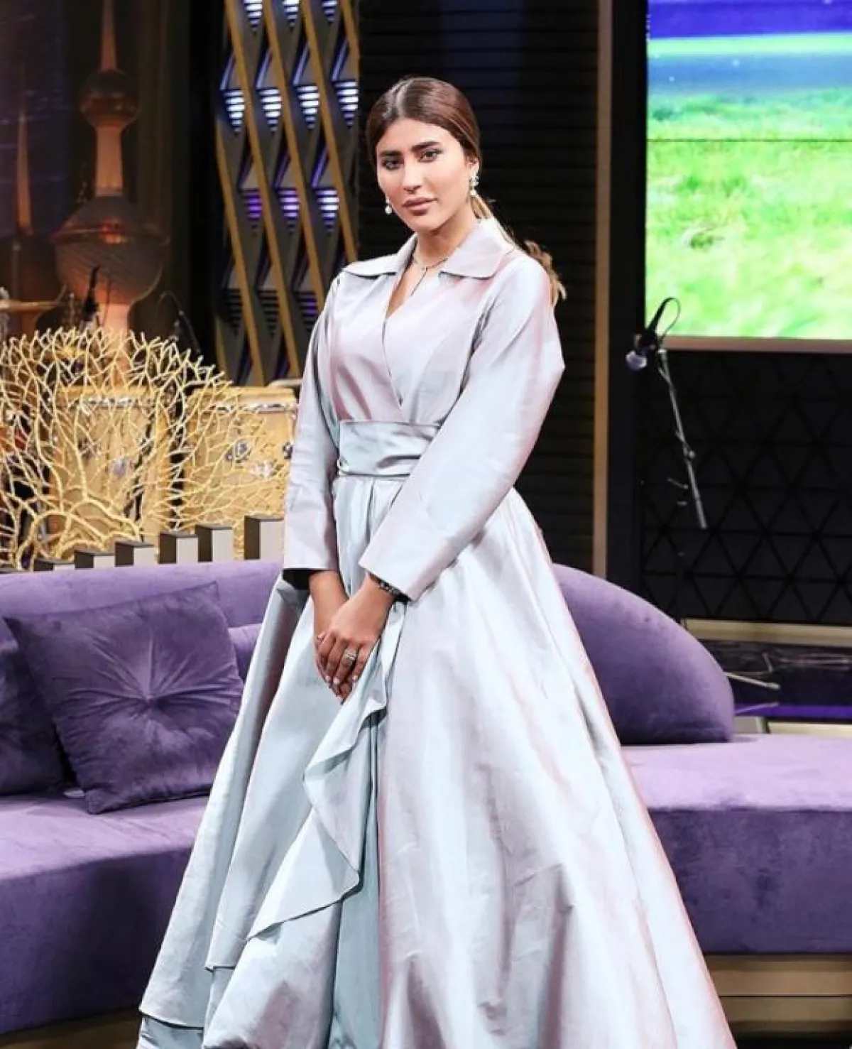 بأحدث اطلالالتها ظهرت النجمة ليلى عبد الله بالعباية الفستان المنفوشة، باللون الفضي المطفي غير اللامع، مع حزام خصر عريض من لون العباية نفسه، حتى لا تبدو مبهرجة مع اللون الزاهي.