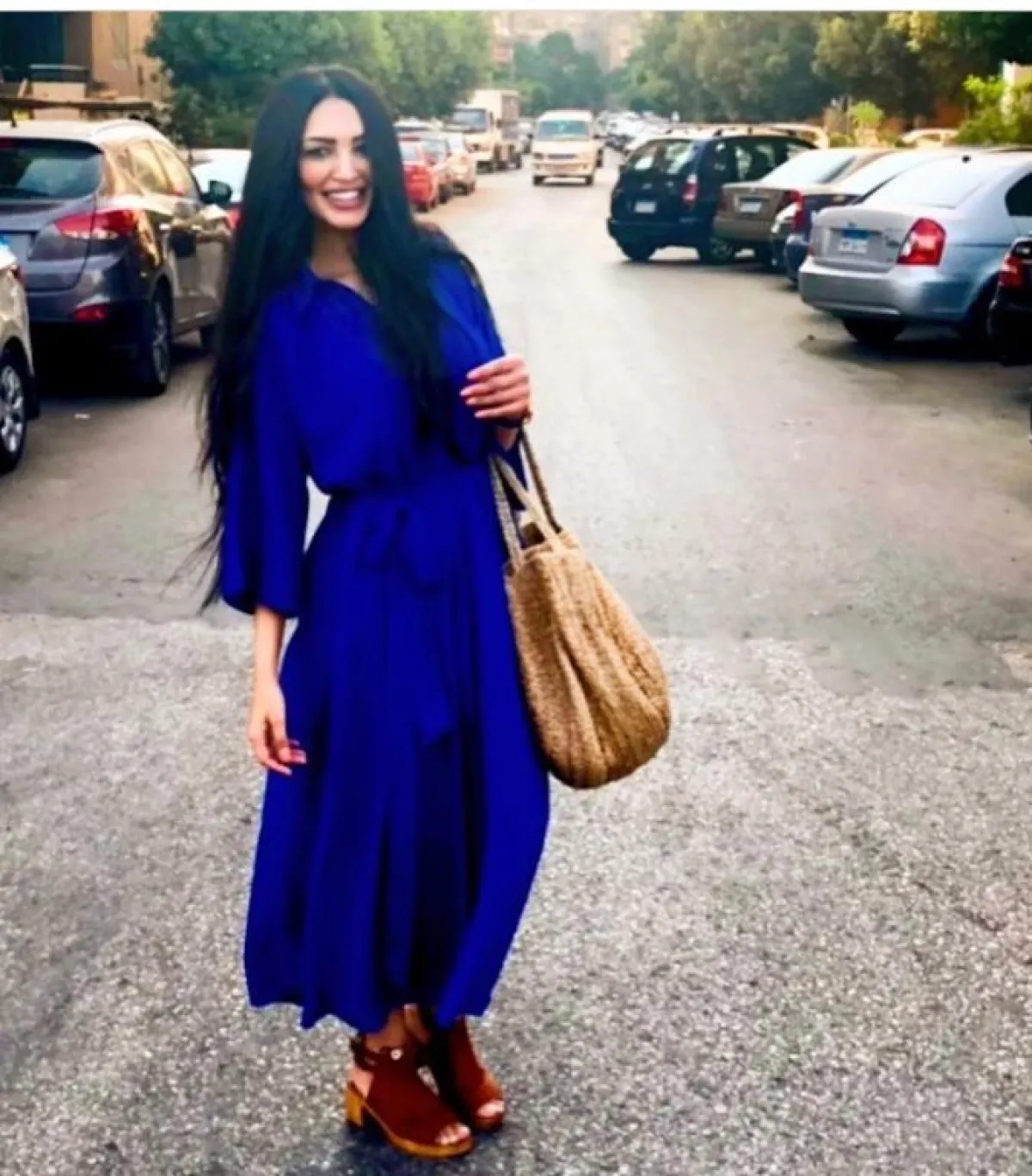 أما الإعلامية سالي عبد السلام فقد اختارت عباية مخصّرة باللون الكحلي الزهري، مع حزام الخصر من العباية نفسها تناسب كل الصبايا، في جميع أوقاتكِ النهارية، نسقت معها شنطة ذهبية لتتماشى مع العباية.