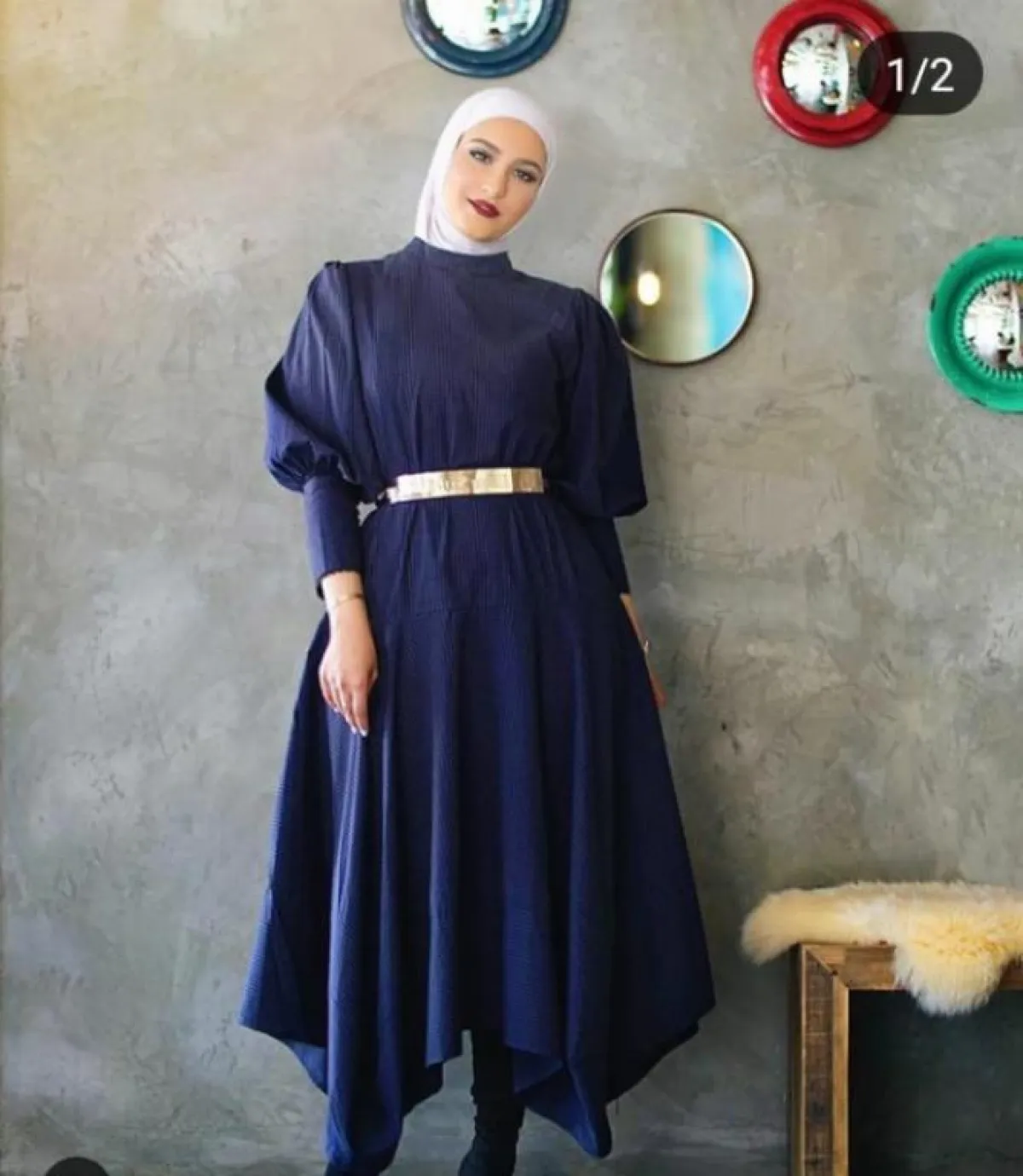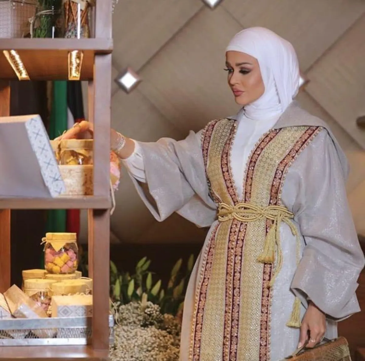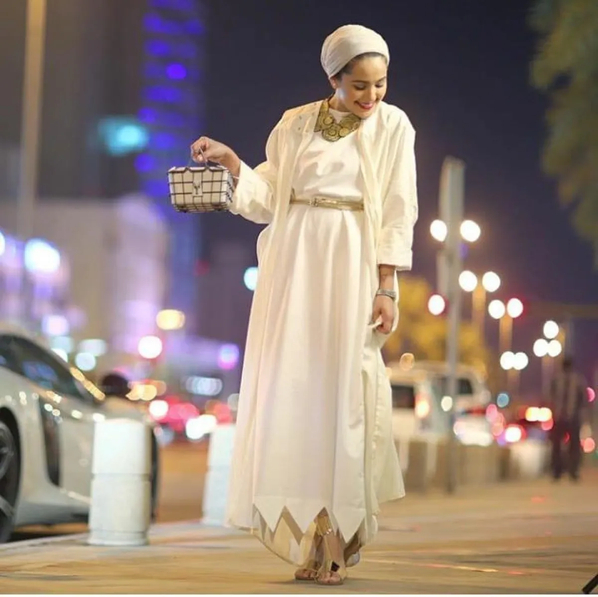 مع الفساتين الواسعة اعتمدت الفاشينيستا دلال الدوب على حزام الذهب المعدني، أضاف لمسة أنيقة بفستان، كما أنه حدد خصرها لتبدو أنحف وأكثر رشاقة، نسقت مع الاطلالة لفة حجاب باللون الأبيض، ولكن إن كنتِ تبحثين عن اطلالة كلاسيكية اختاري الطرحة الستان الذهبية.