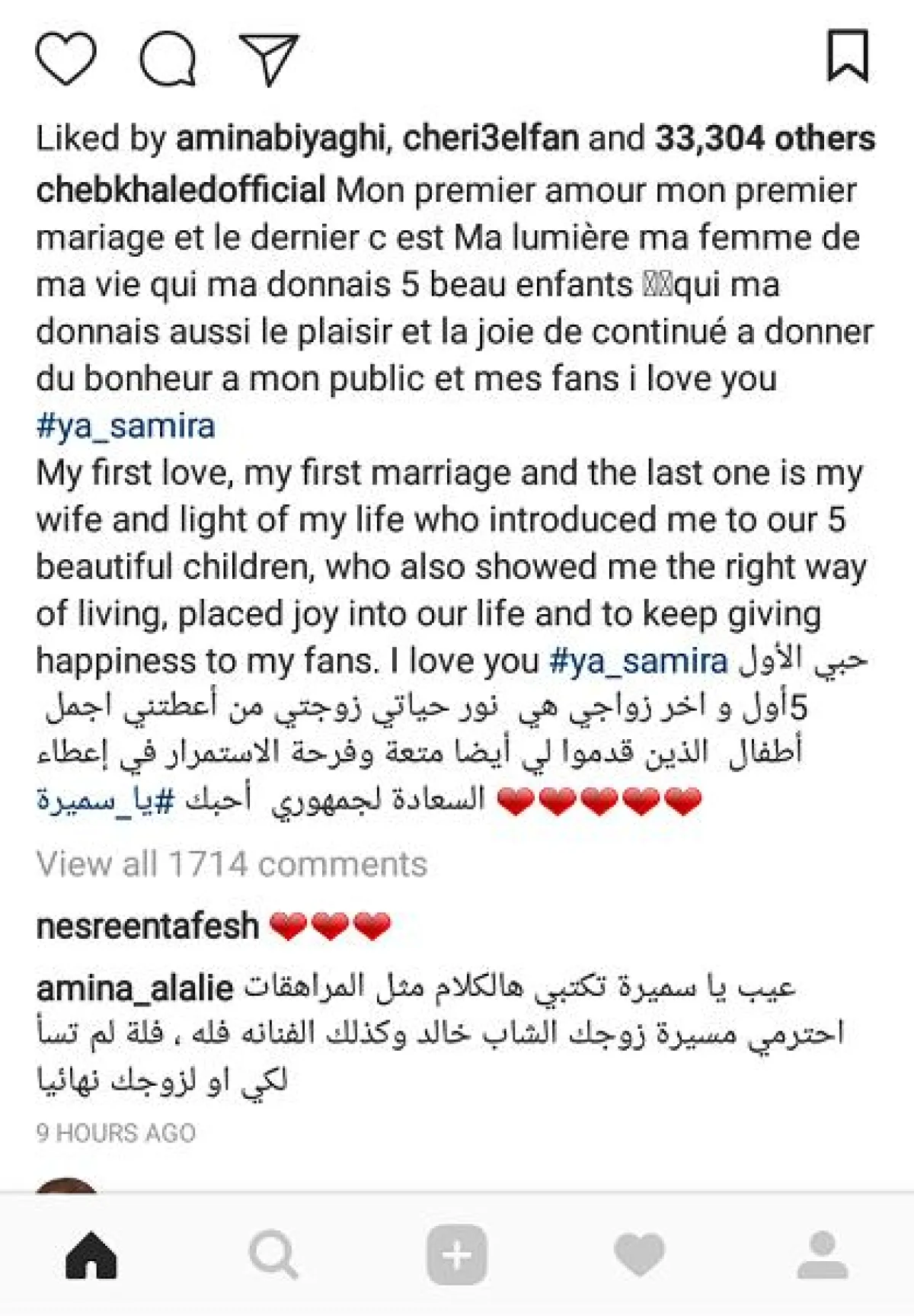 تعليق الشاب خالد لم يرق للبعض ومن بينهم الفنانة أمينة العلي التي أشارت إلى أن زوجته سميرة هي التي كتبت التعليق، كما استغربت ردة فعلها، لأن فلة الجزائرية لم تقل كلاماً مؤذياً في حقها وحقه.