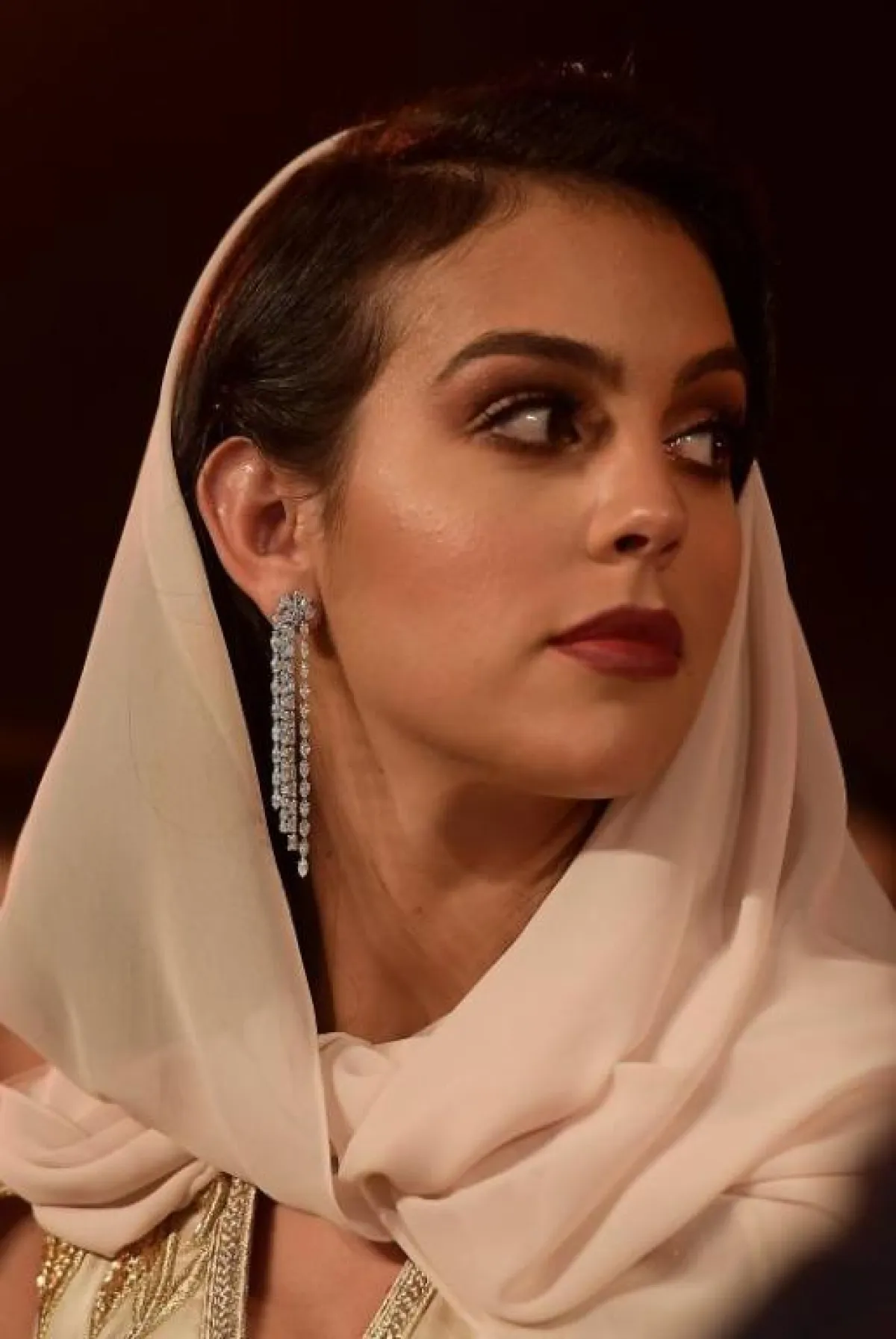وقد تألقت البرتغالية جورجينا رودريغيز Georgina Rodriguez باطلالة محتشمة مميزة، حيث ظهرت بقفطان مغربي باللون الذهبي، مرفقًا بغطاء رأس محتشم من تصميم صوفيا بن يحيى.