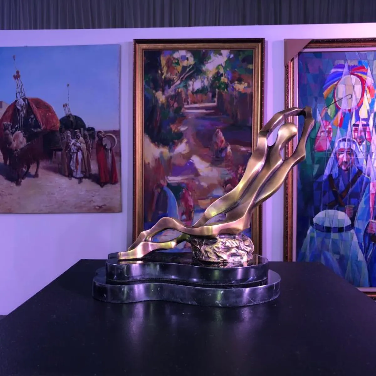 النحات عادل عبداللطيف شارك بـ3 منحوتات تتحدث عن الأحاسيس والمشاعر الإنسانية التي يمر بها الإنسان في حياته اليومية من حزن وفرح وغيرها، الخامة المستخدمة في أعماله هي خامة الخزف الذي يتم صبغه ليظهر بالشكل النحاسي.