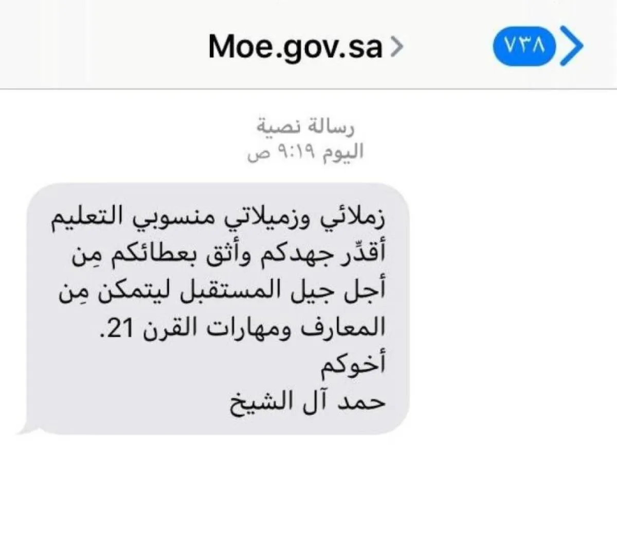وكان وزير التعليم الجديد قد بعث صباح اليوم الأحد في أول أيام الدراسة، رسالةً نصيةً مكتوبة إلى كل المعلمين والمعلمات وصلت إليهم عبر هواتفهم المحمولة المتضمنة في برامج الوزارة "نور" و"فارس"؛ مستغلاً التقنية الحديثة في التواصل المباشر، أعرب فيها عن تقديره التام لجهود وعطاء كافة المعلمين والمعلمات.
