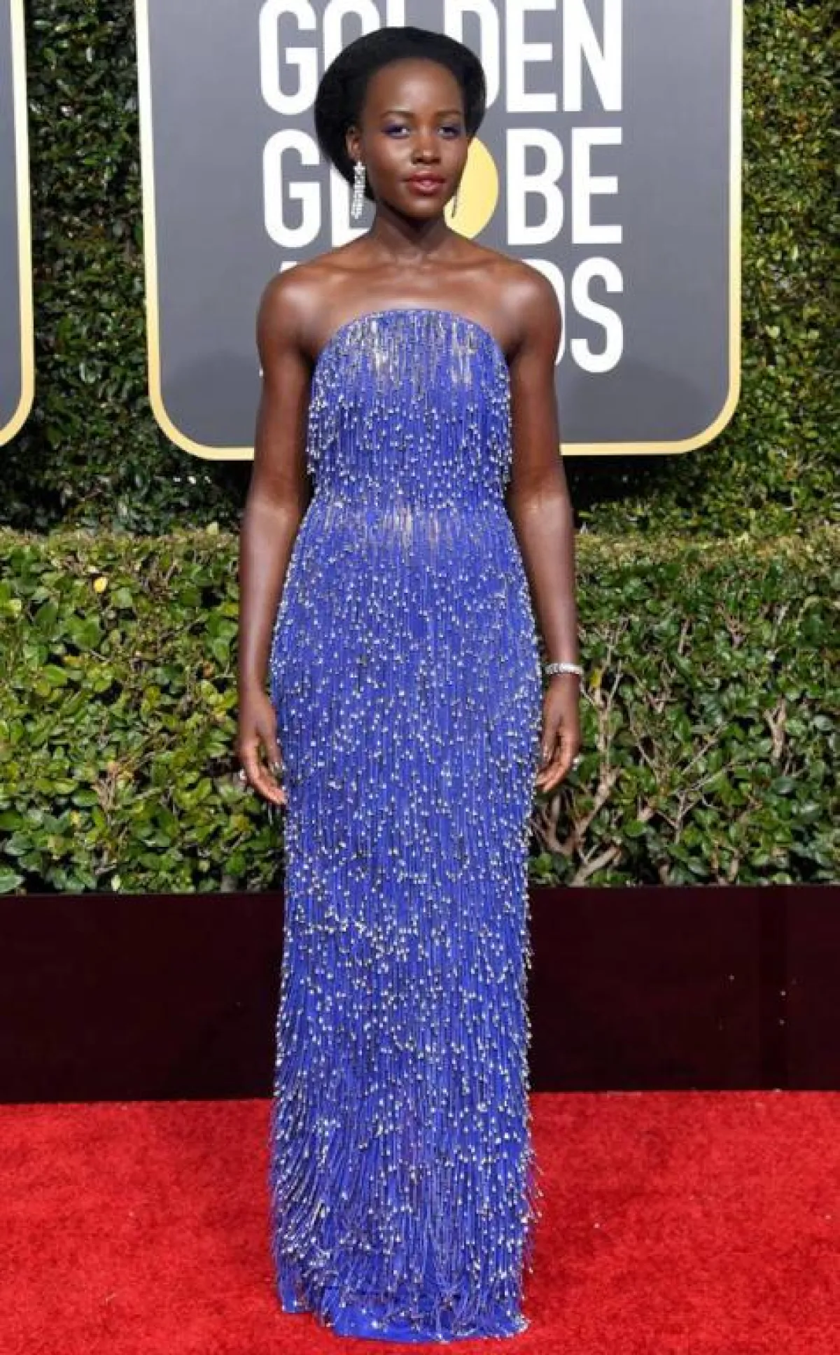 تعشق لوبيتا نيونغو Lupita Nyongo الاطلالات المبتكرة واللافتة. ولحفل الغولدن غلوبز Golden Globes مساء أمس اختارت فستانا مميزا من كالفين كلاين Calvin Klein باللون البنفسجي الغني وبقصة بسيطة من دون أكمام، مزين بشكل كامل بشراريب براقة. وقد أكملت اللوك بمجوهرات ماسية ناعمة ومميزة.