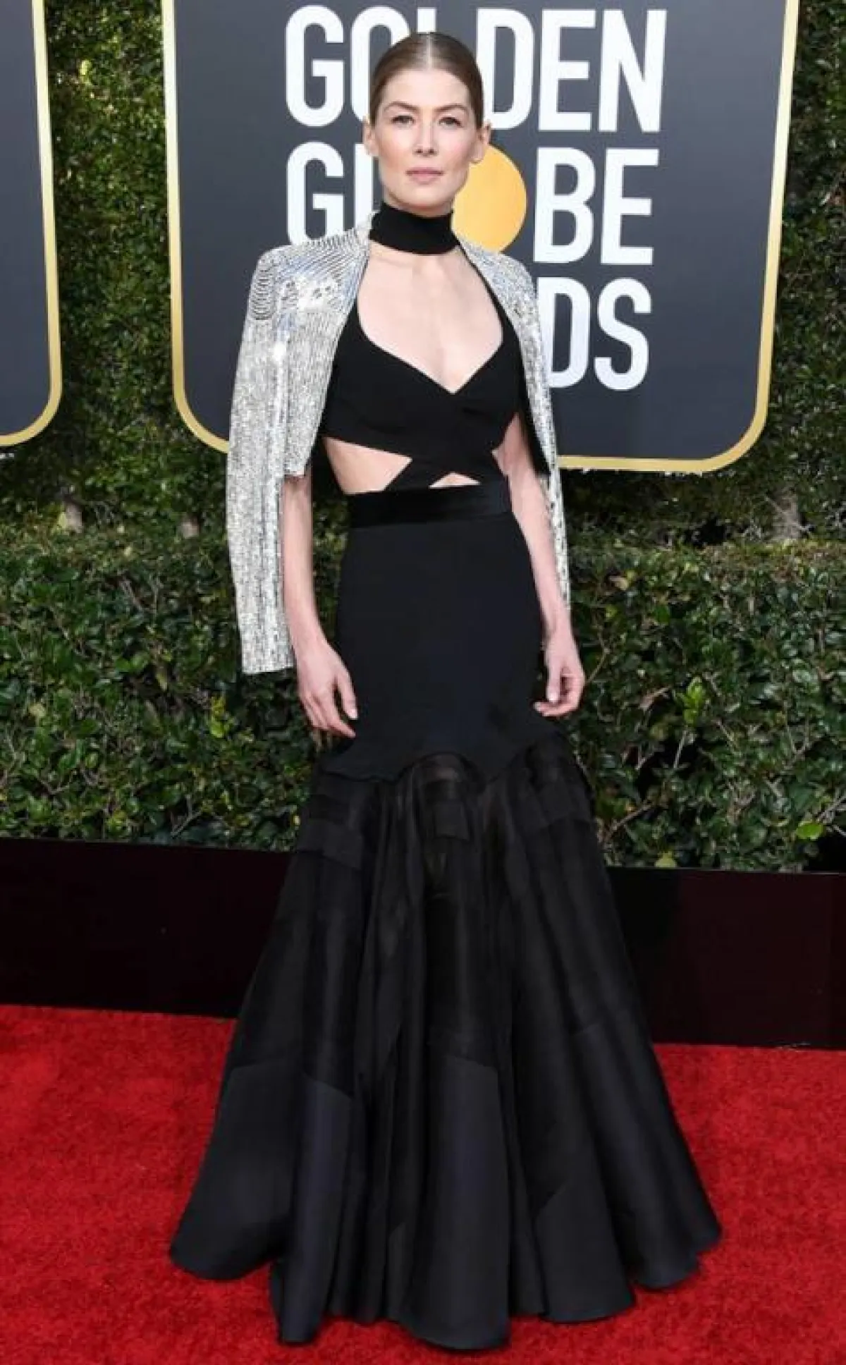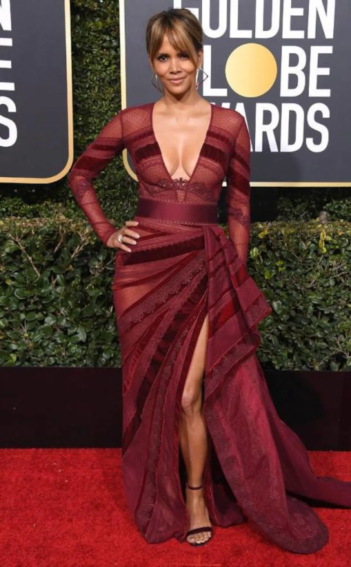 أظهرت هالي بيري Halle Berry جاذبيتها من خلال فستان باللون الأحمر العنابي اختارته من “زهير مراد” Zuhair Murad مصنوعة من مزيج قماش الدانتيل مع التول والأورغانزا، مفتوح عند الياقة على شكل حرفV وتنورته منسدلة مع شق طويل على الساق، وقد أكملت اللوك بصندل كعب عال من نفس اللون ومجوهرات ناعمة.