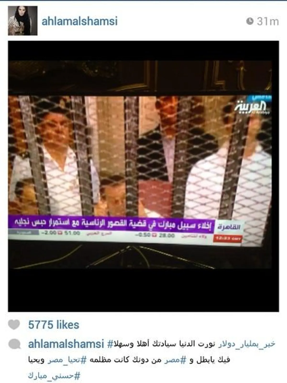 رحّبت الفنّانة الإماراتيّة أحلام بإخلاء سبيل الرئيس المصريّ السابق حسني مبارك، عبر حسابها الخاصّ على Instagram، حيث نشرت صورة الخبر المنقول عن إحدى القنوات العربيّة وكتبت: "خبر بمليار دولار نورّت الدنيا سيادتك، أهلاً وسهلاً فيك يا بطل، ومصر من دونك كانت مظلمة. تحيا مصر ويحيا حسني مبارك".