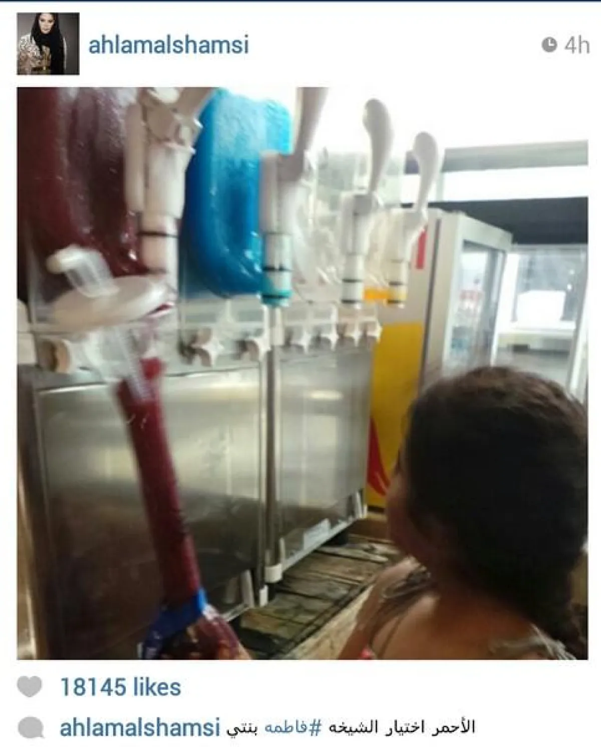 ونشرت أحلام صورة لابنتها فاطمة، من دون إبراز وجهها كالعادة، بينما كانت تختار شراب عصير "الفريسكو"، وقالت لابنتها لولوة: "بالهناء والشفاء، فديت شيخة الزين".