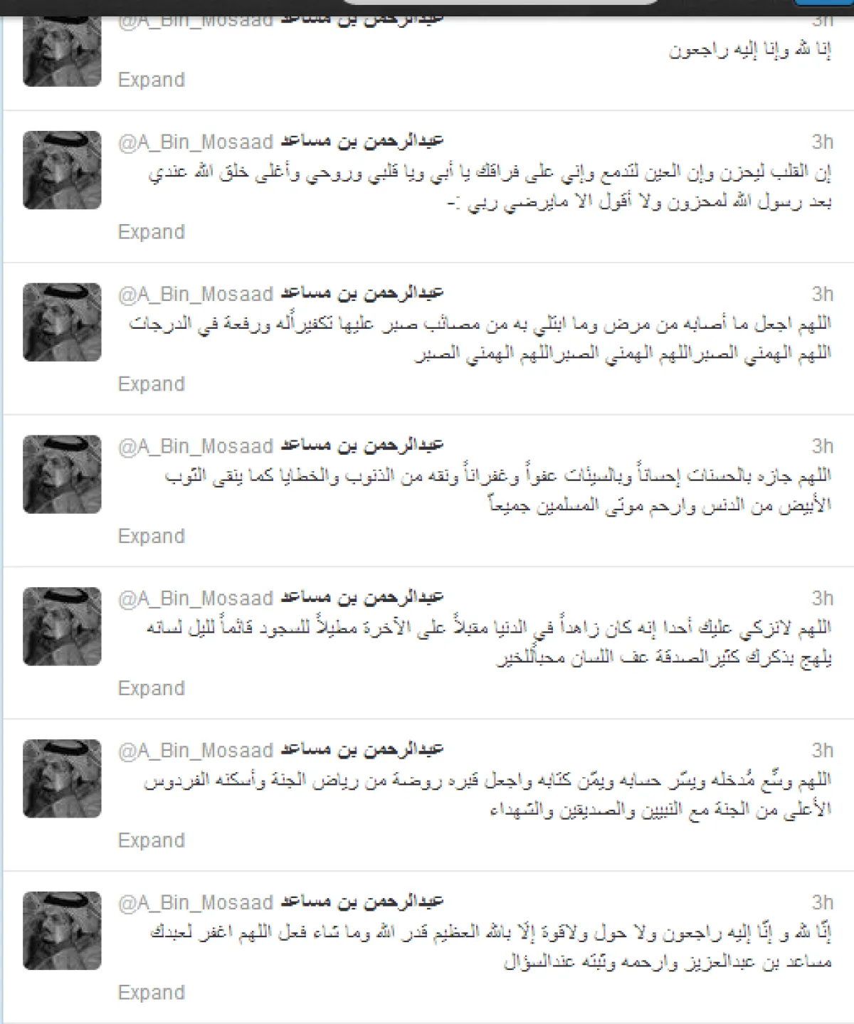 وقد أكد هذا الخبر ابنه الأمير الشاعر عبد الرحمن بن مساعد، على صفحته الرسمية على موقع تويتر حيث كتب: "إنّا لله وإنّا إليه راجعون ولا حول ولا قوة إلَا بالله العظيم، قدر الله وما شاء فعل، اللهم اغفر لعبدك مساعد بن عبدالعزيز وارحمه وثبته عند السؤال".