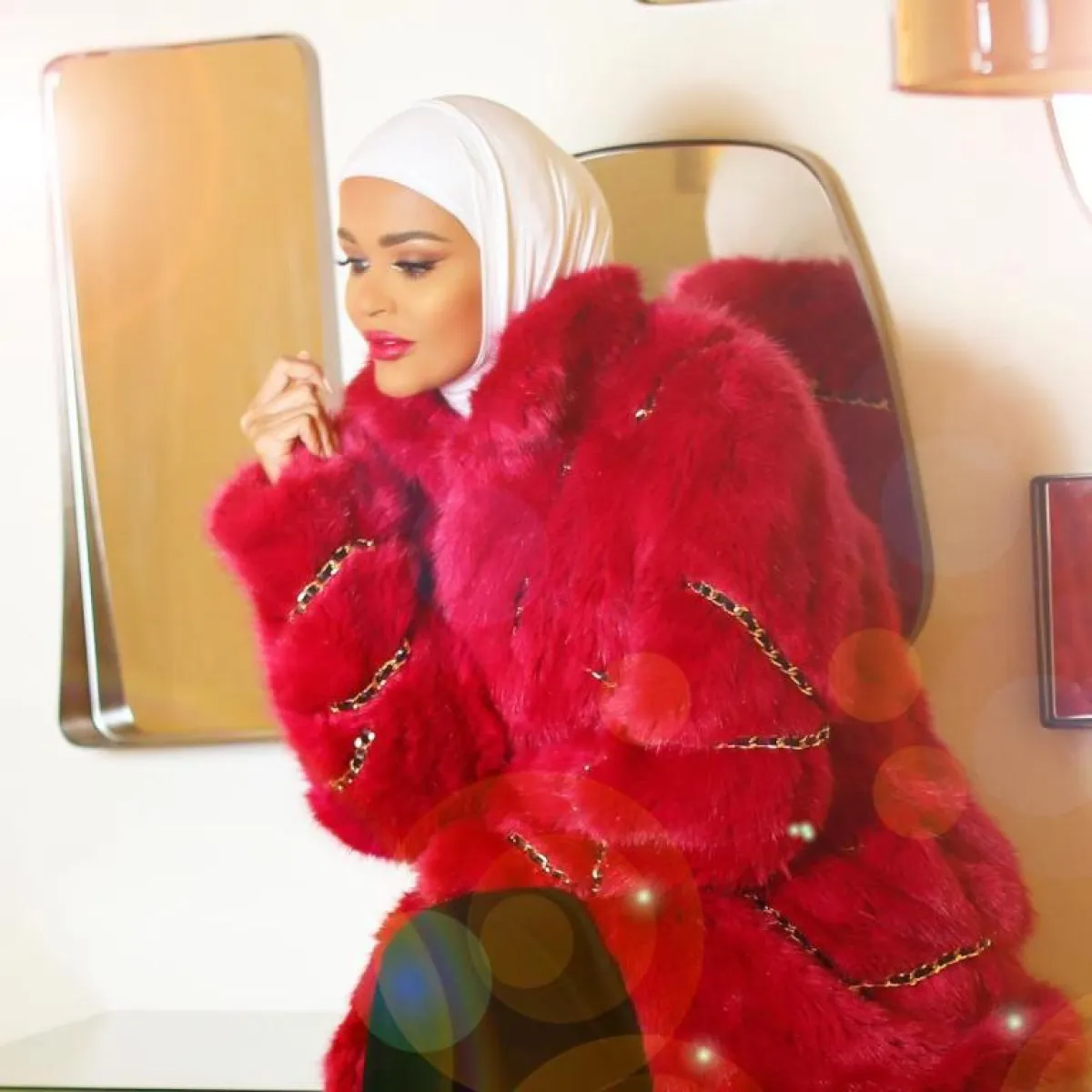 اعتمدت دانة الطويرش معطفاً من الفراء باللون الأحمر بظل أحمر مائل إلى البرتقالي، ونسقته مع فستان ربيعي مورد بالأحمر أيضاً، كما اعتمدت جاكيت جلد باللون الذهبي الصريح، أما الأبيض فكان قطعة مشتركة في كثير من إطلالاتها، كما نسقته بأسلوب عصري مع ألوان قوية مثل تنورة ميدي من المخمل باللون الأرجواني.