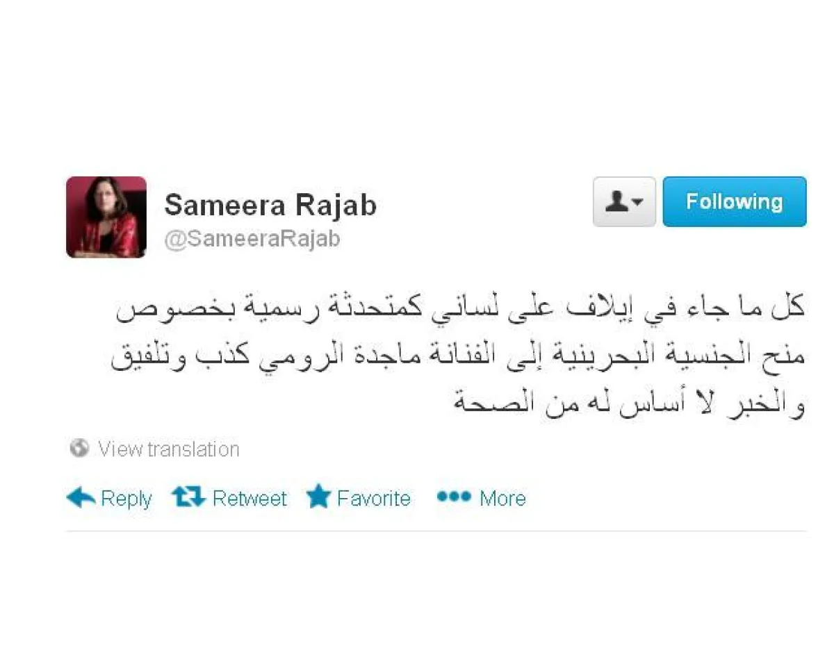 من جهتها، نفت سميرة رجب عبر صفحتها الشخصية على تويتر الخبر وقالت "كل ما جاء في إيلاف ونقلته الأيام البحرينية على لساني كمتحدثة رسمية بخصوص منح الجنسية البحرينية إلى الفنانة ماجدة الرومي كذب وتلفيق والخبر لا أساس له من الصحة".