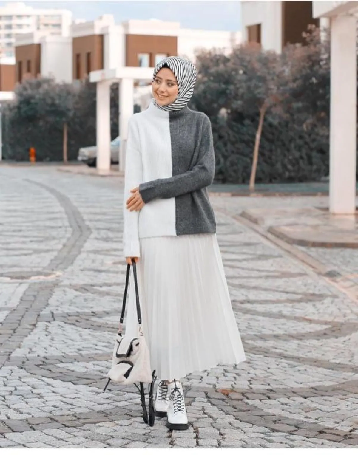 التنانير الطويلة المنسدلة بستايل البيليسيه، من الصيحات الرائجة بشكل كبير هذا العام، يمكنك تنسقيها على طريقة Aybuke Nur أيبكي نور ، مع البولفر الطويل بلوني الرمادي والأبيض، لإطلالة مناسبة أكثر للأجواء النهارية.