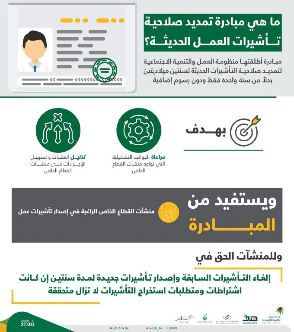 أطلقت وزارة العمل والتنمية الاجتماعية مبادرة "تمديد صلاحية تأشيرات العمل الحديثة" لسنتين إضافيتين بدلاً من سنة واحدة، بدون رسوم إضافية.