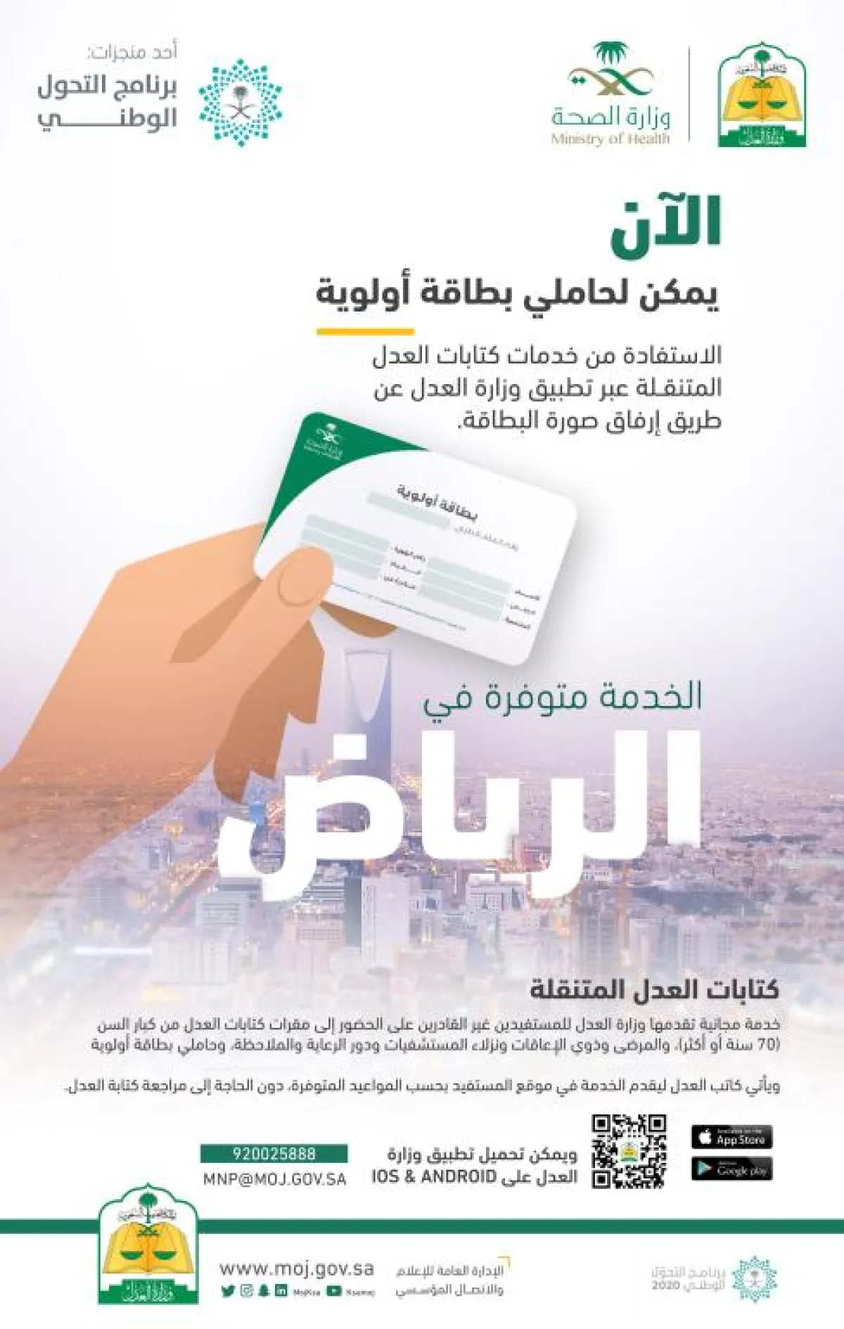للارتقاء بجودة الخدمات المقدمة للمواطنين، أعلنت وزارتا العدل والصحة تنفيذ مشروع تعاون يستطيع من خلاله حاملو بطاقة "أولوية" التي تصدرها وزارة الصحة الاستفادة من خدمة كتابات العدل المتنقلة التي أطلقتها وزارة العدل قبل أكثر من عام.