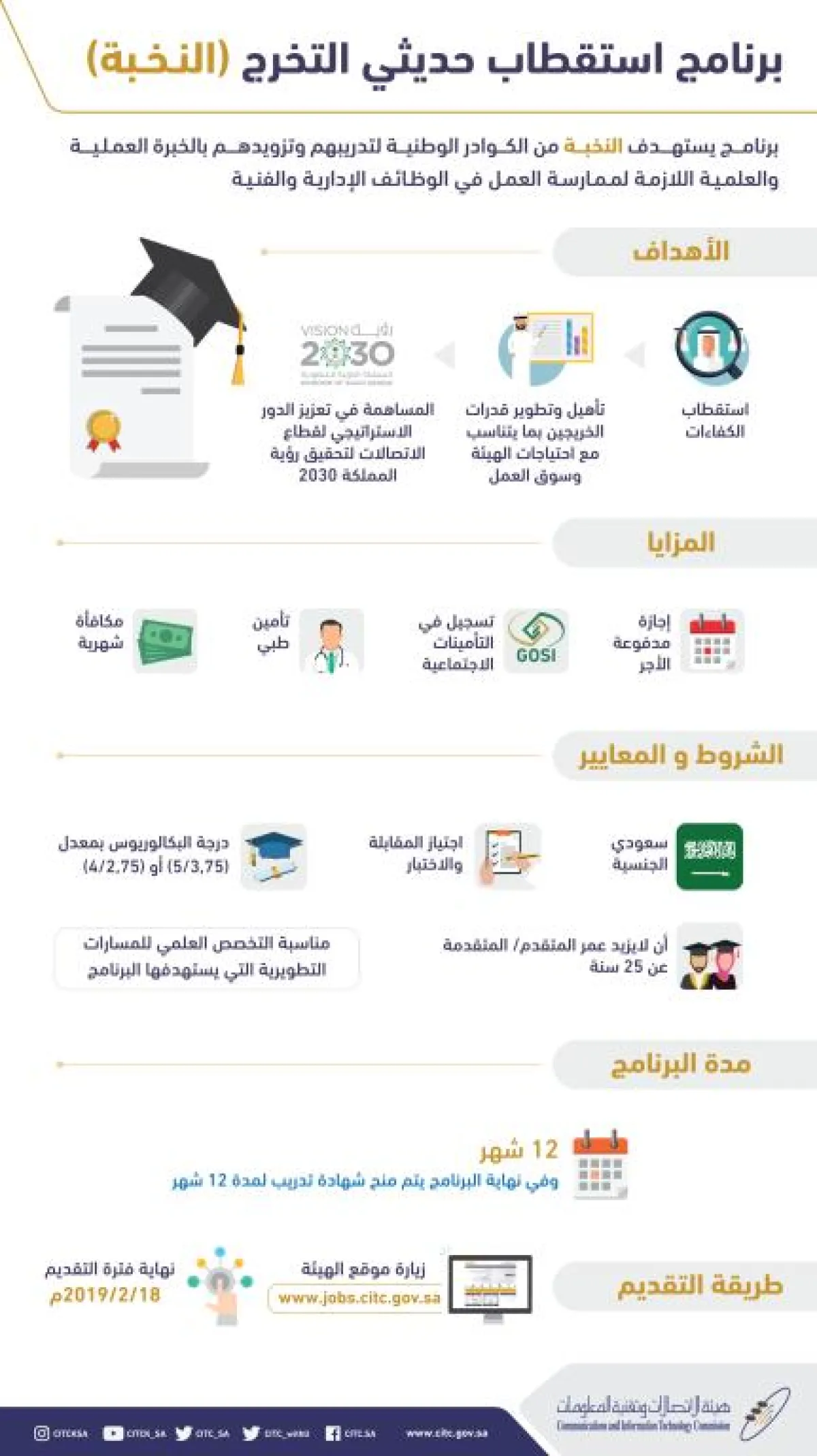 في إطار الخطط الاستراتيجية التي رسمتها هيئة الاتصالات وتقنية المعلومات لتوسيع قاعدة استثماراتها في تنمية الكوادر البشرية الشابة بما يتسق مع رؤية المملكة 2030، فقد أطلقت الهيئة برنامج استقطاب حديثي التخرج "النخبة"، والذي يستهدف الكفاءات الوطنية من الشباب والشابات حديثي التخرج في درجة البكالوريوس من مختلف التخصصات.