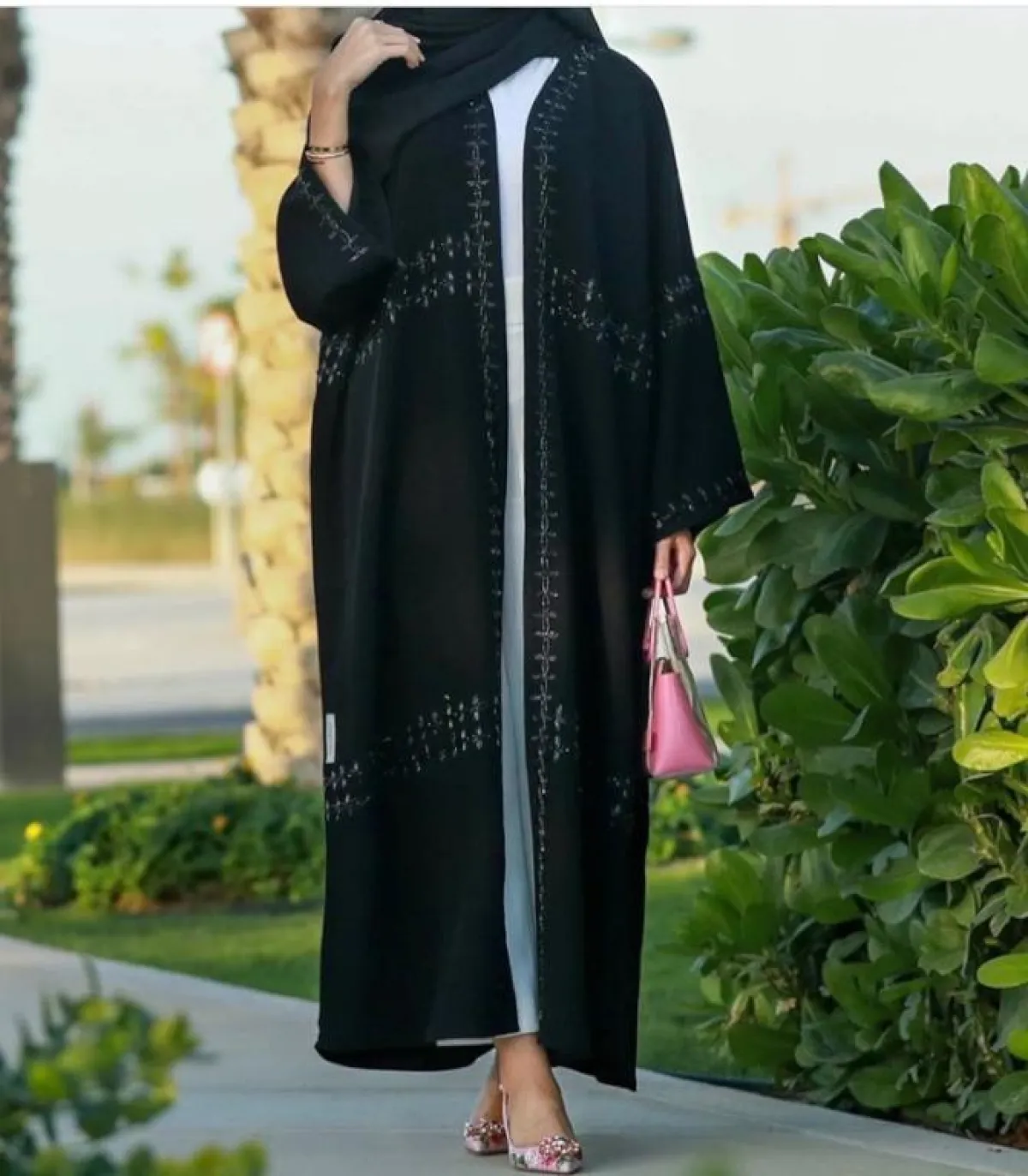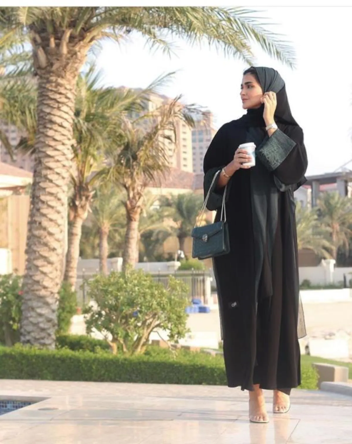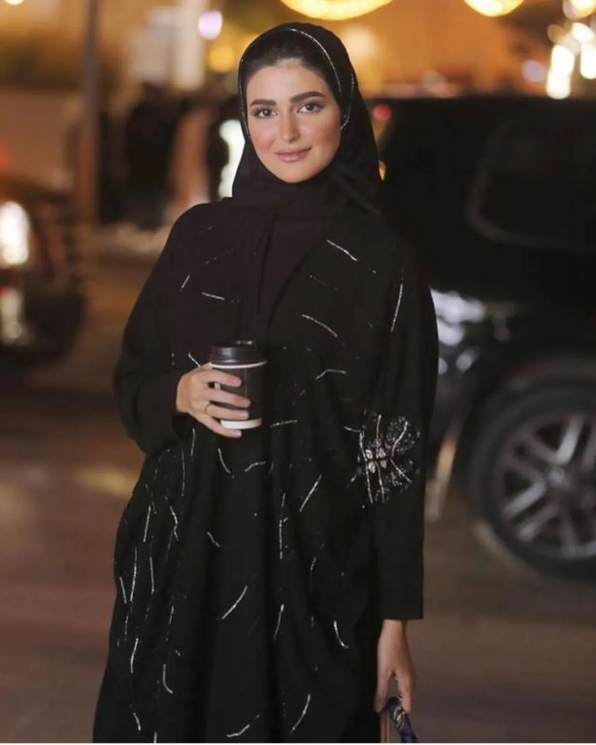 أعجبنا العباية السوداء الشبابية، مع رسومات الخطوط البيضاء بشكل عشوائي، بأكمام واسعة لا تضيف لكِ وزنًا، اختارتها في الليل مع حجاب أسود، ويمكنكِ اعتمادها أيضًا مع أيّ لون مخملي تفضلينه، وشنطة كبيرة الحجم.