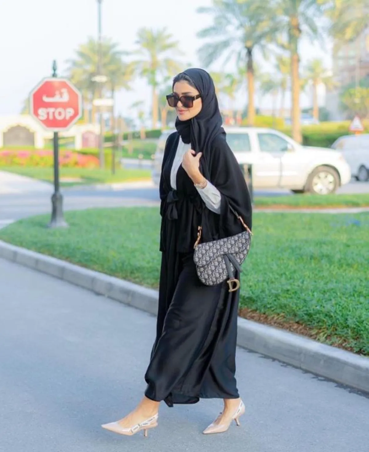 العبايات بالألوان الفاتحة صيحة أصبحت تعتمدها كثير من الفاشينيستات، بخاصة وأنّ الألوان الداكنة لم تعد هي فقط من لها الأولوية بموسم الشتاء، كالعباية النود الروز، مع بطانة بيضاء، نسقت معها طرحة بلون العباية نفسها، والشنطة الجملي، وأكملت اللوك بكعب أبيض قصير، أضاف لمسة كلاسيكية بسيطة لمظهرها.