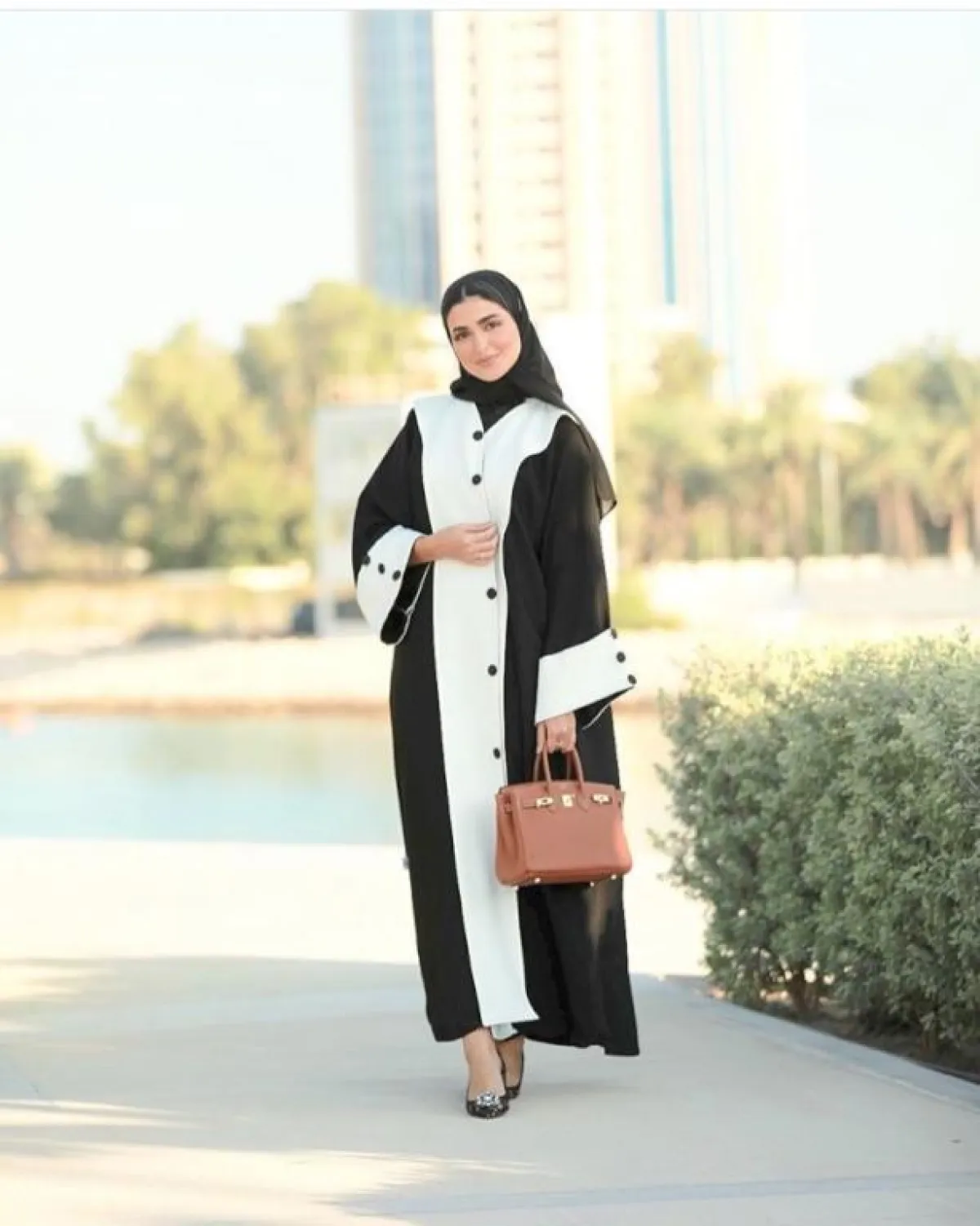 كما اختارت التصميم البسيط من العباية بلوني الأبيض مع الأسود مع الأكمام الواسعة، والأزرار السوداء كبيرة الحجم، تناسبكِ أكثر بأوقات النهار، مع كعب عالٍ بسيط، وأعجبنا التنسيق للشنطة باللون الجملي من هيرميس Hermes كبيرة الحجم لتصلح لكل المشاوير.