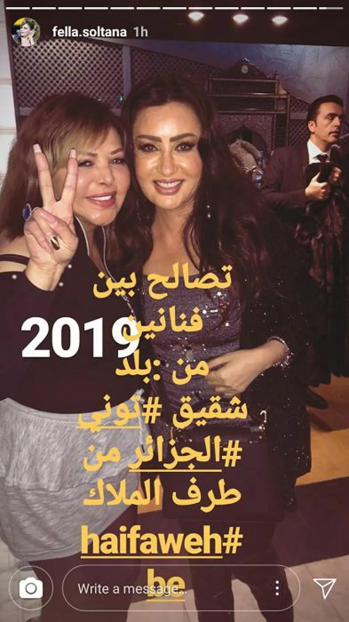 وانتشر فيديو لهيفاء وهي ترقص إحتفاءً بعيد ميلاد صديقتها، كما نشرت هيفاء أيضاً صوراً من الحفل عبر حسابها على "إنستا ستوري"، وكذلك فعلت فلة الجزائرية التي علقت على مصالحتها بالفنانة لطيفة "مصالحة فنانتين من بلدين شقيقين تونس والجزائر من طرف الملاك هيفاء وهبي".