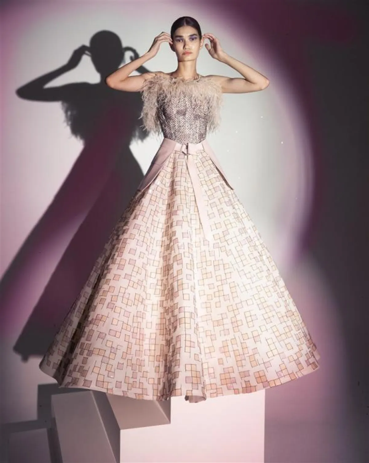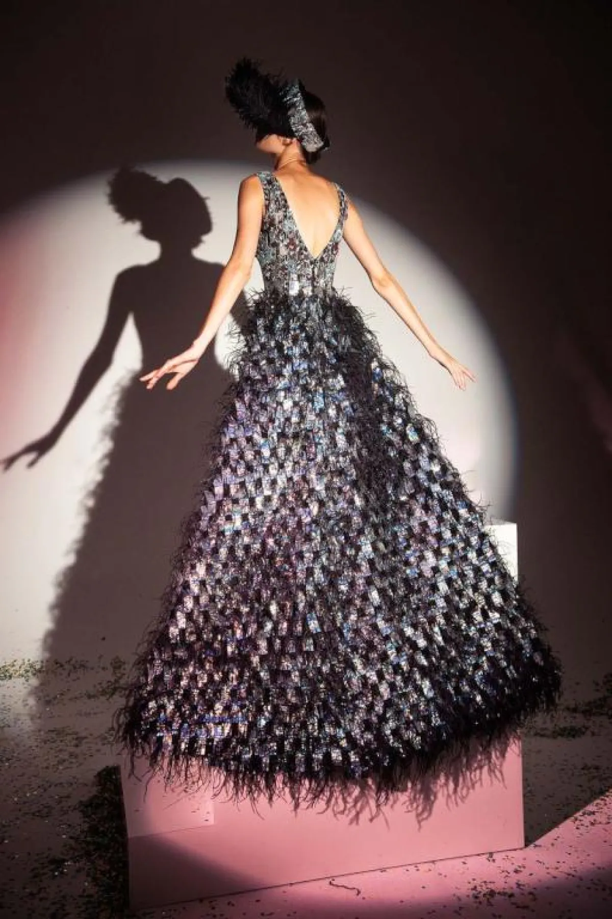 وإستخدم زياد نكد الأقمشة الشفافة الراقية، وظهر الريش في أكثر من منطقة بالفستان، سواء على الأكتاف أو أطراف الأكمام ونهاية التنانير.