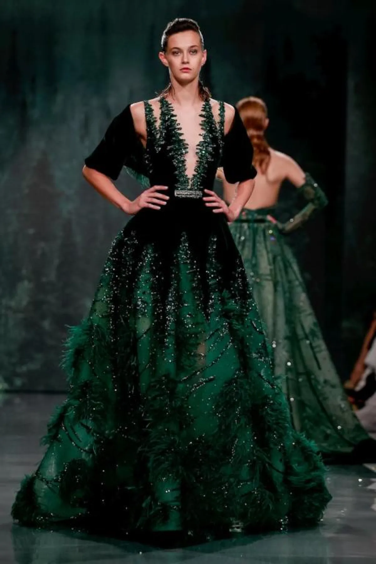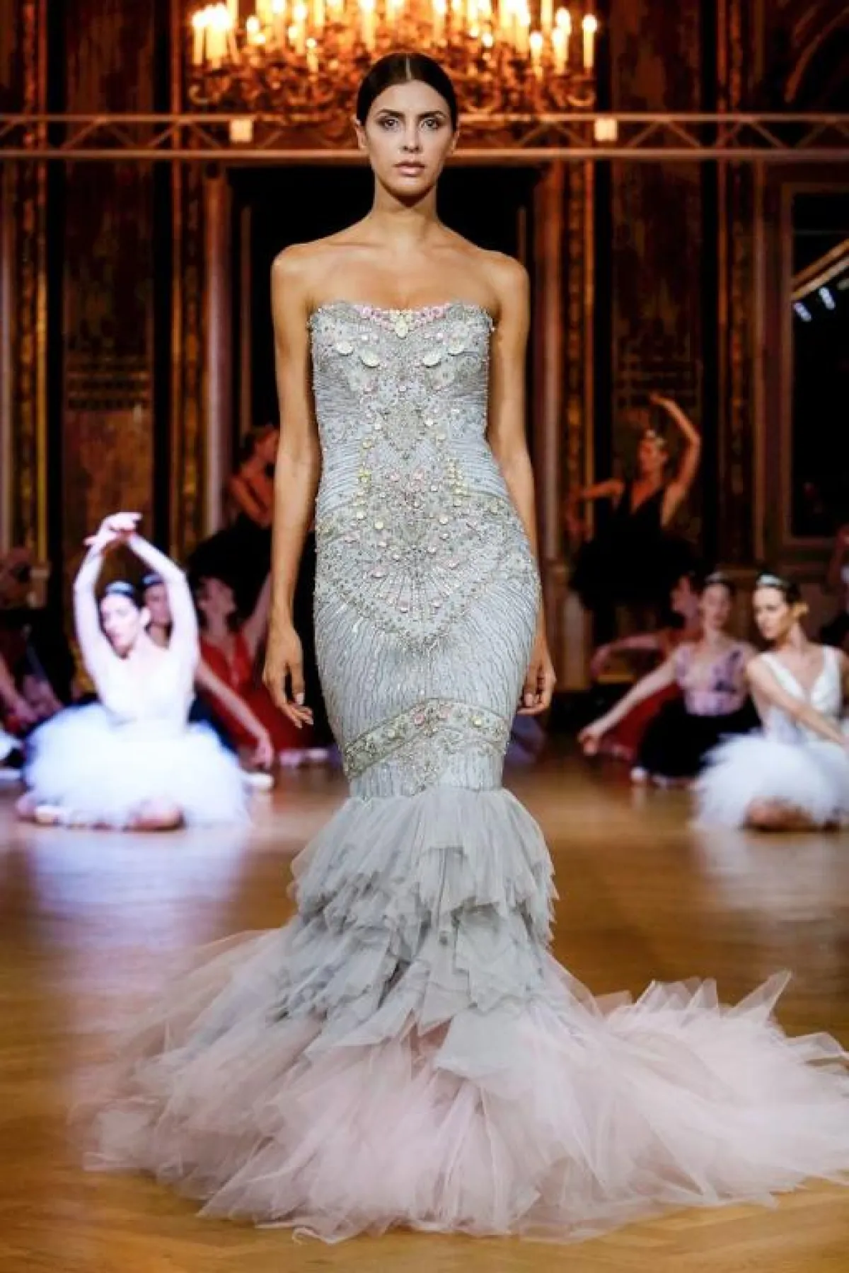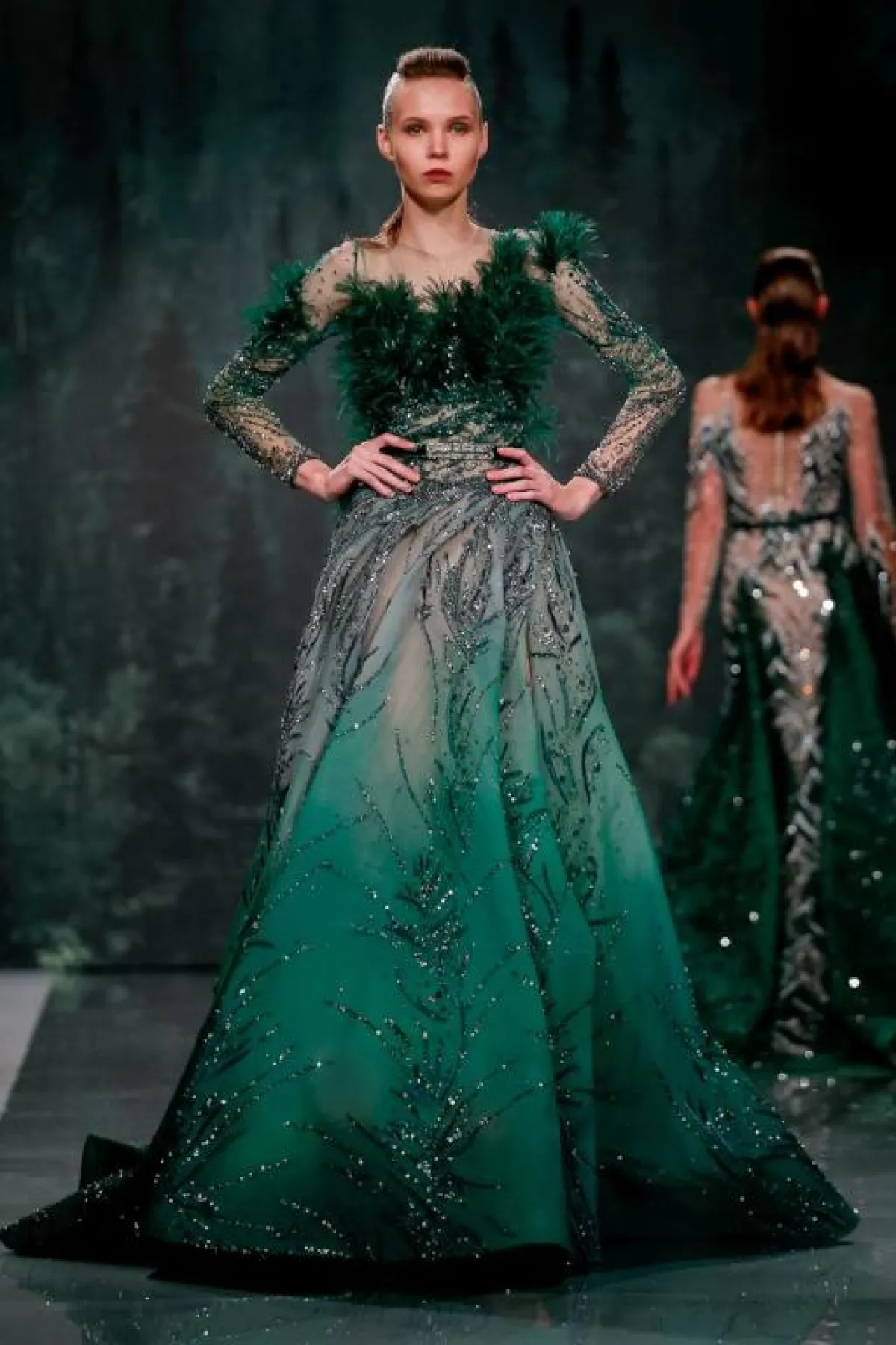 وإلى المصمم اللبناني زياد نكد Ziad Nakad، حيث الفساتين الفخمة المزينة بالتطريزات البرّاقة والريش بحسب لون الفستان.