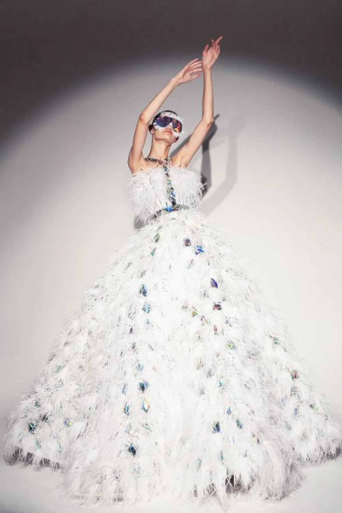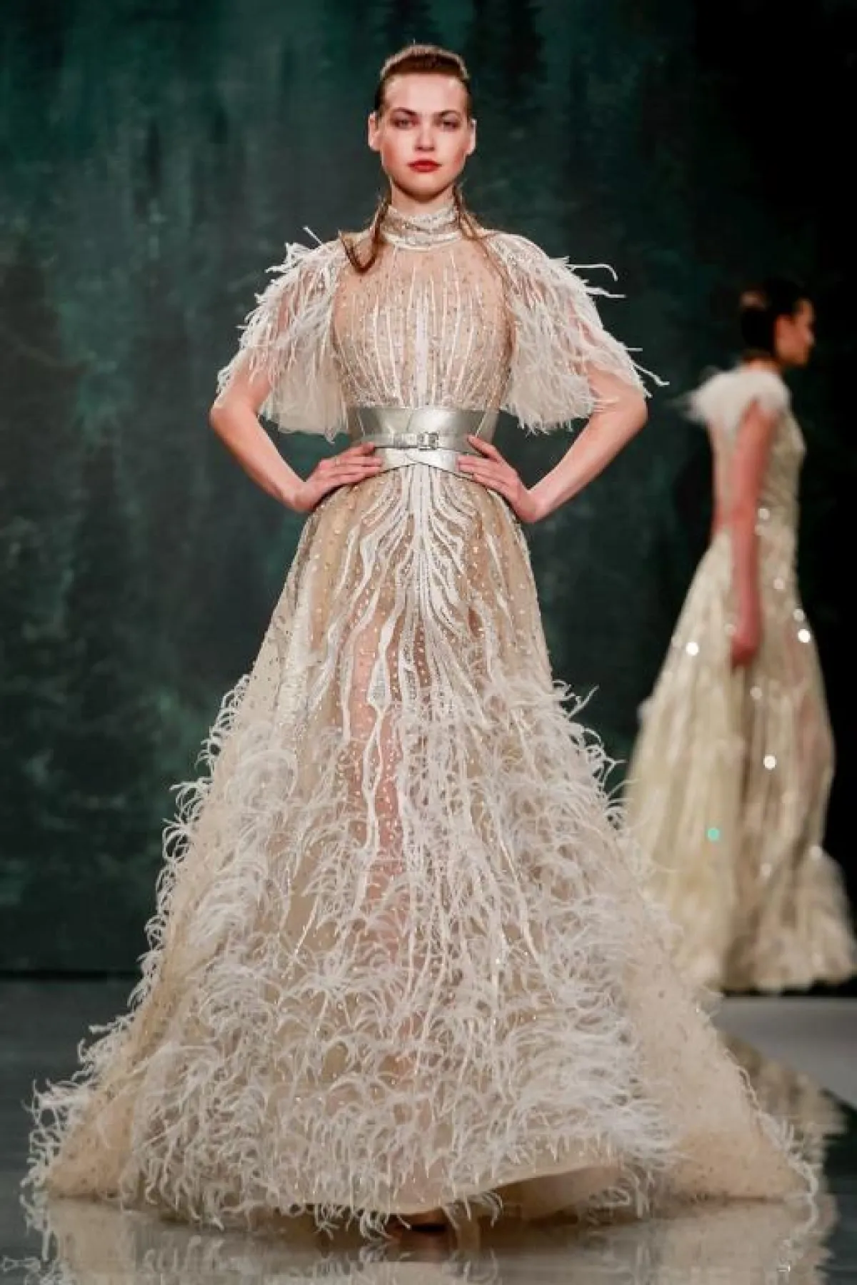 وأبدع المصمم رامي قاضي Rami Kadi فساتين منفوشة ومغطاة بالريش، بدت لافتة للأنظار وغير تقليدية، حيث تظهر في الفستان عدة ألوان مع لمعان أخّاذ، يغطيه الريش الفاخر، وهي تناسب العروس النحيفة، حيث يساعد الريش في جعلها تبدو أكبر حجمهاً وتخفي عيوب الجسم النحيل.
