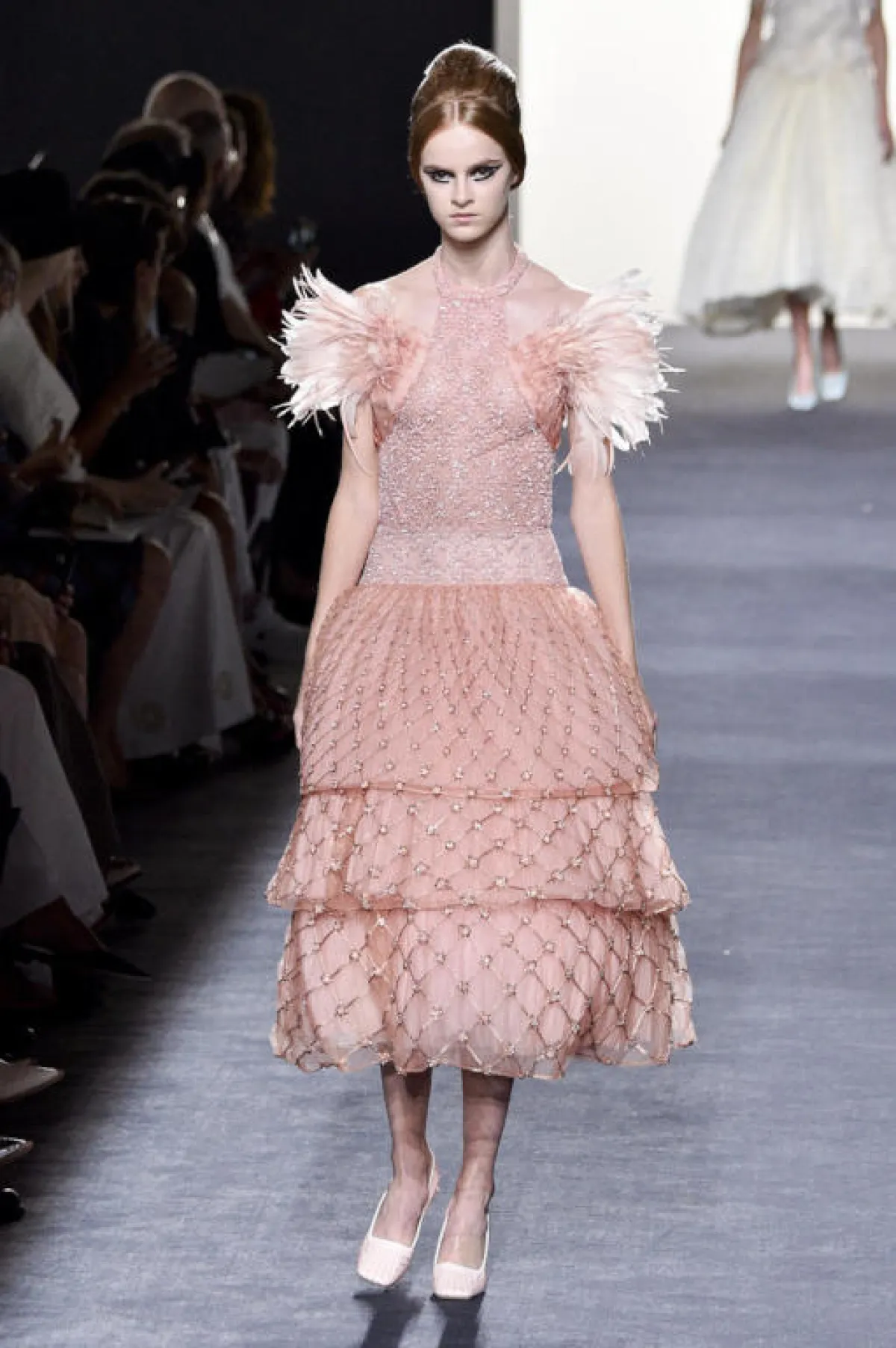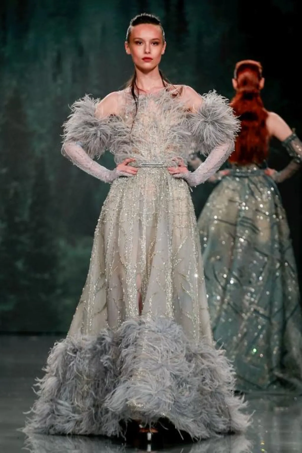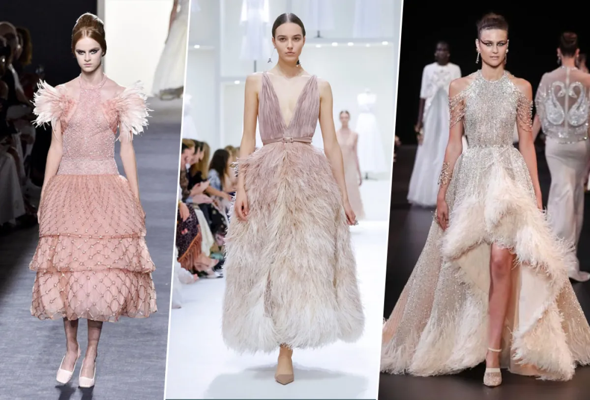ويمكن أن يكون الريش في لمسة بسيطة على الأكمام أو الأكتاف أو التنورة، مثل فستان فندي Fendi أو يغطي التنورة بالكامل مثل فساتين Alfazairy، وديور Dior.