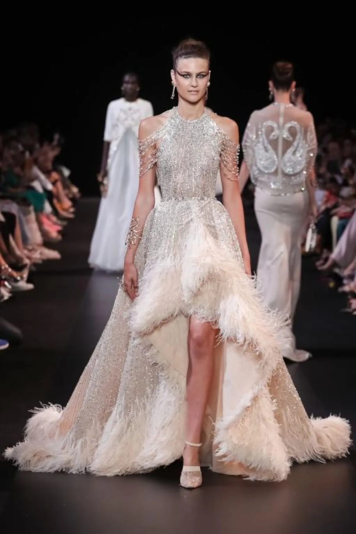 وقدم المصمم جورج حبيقة Georges Hobeika فساتين خطوبة مزينة بالريش على التنانير، سواء في نهاية التنورة أو يغطيها بالكامل، وما تميزت به فساتين جورج حبيقة أن الريش يتناغم مع التطريزات البرّاقة لمزيد من الفخامة.