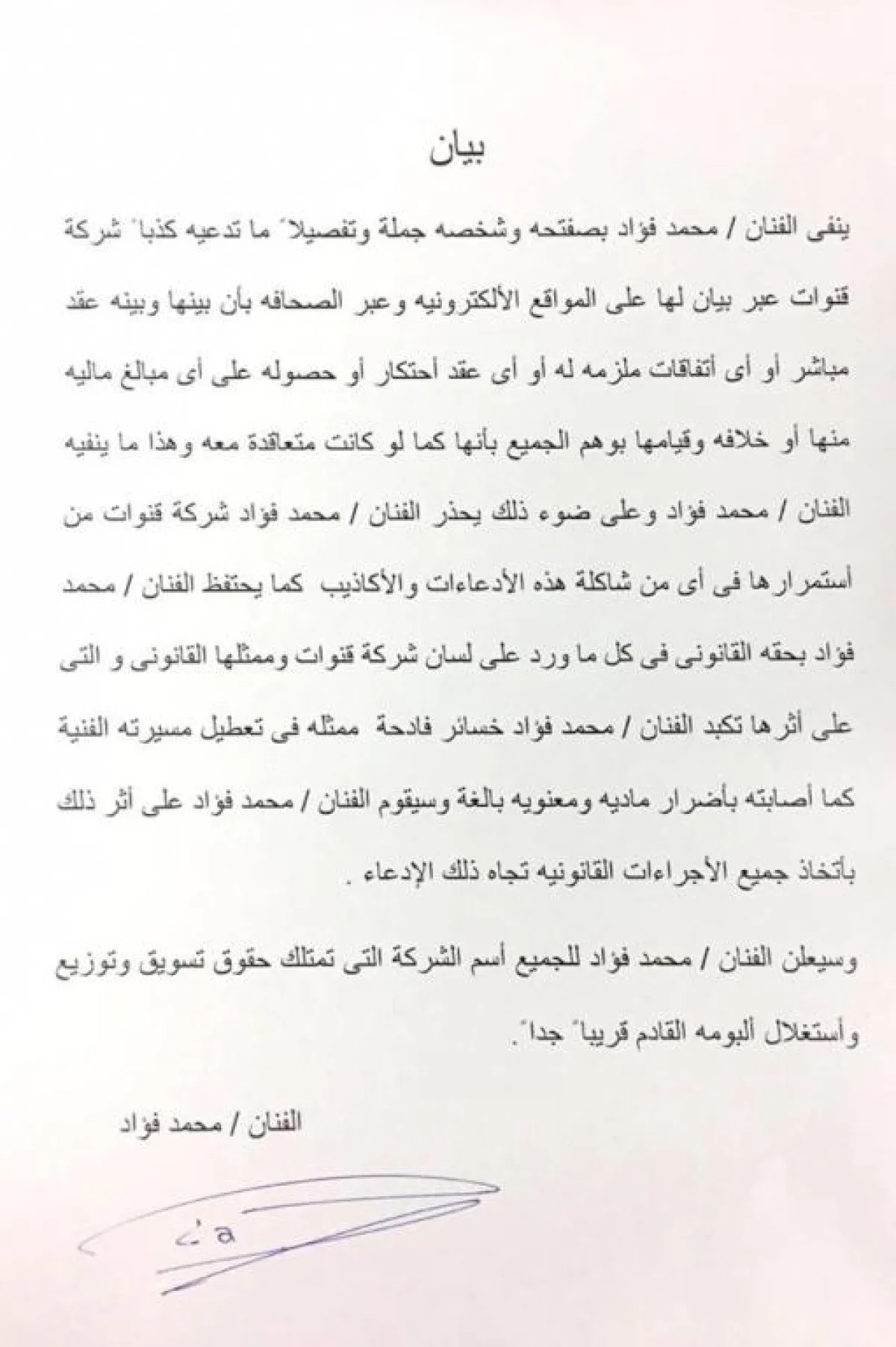 وقال فؤاد عبر البيان الرسمي: ينفى الفنان محمد فؤاد بصفته وشخصه جملة وتفصيلا ً ما تدّعيه كذبا ً شركة قنوات عبر بيان لها على المواقع الإلكترونية وعبر الصحافة بأن بينها وبينه عقد مباشر أو أي اتفاقات ملزمة له، أو أي عقد احتكار أو حصوله على أي مبالغ مالية منها أو خلافه، وقيامها بوهم الجميع بأنها كما لو كانت متعاقدة معه.