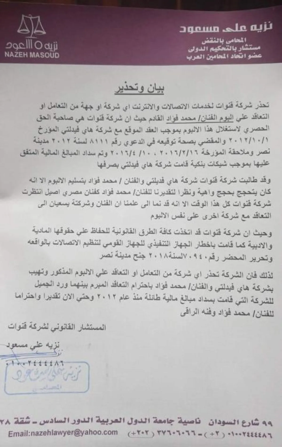 يذكر أن شركة "قنوات" وجهت تحذيرا إلى جميع الشركات الأخرى من التعاون مع فؤاد وتسويق ألبومه الجديد، لأنها صاحبة الحق الحصري بتعاقد تم منذ العام 2012ـ وحسب بيان رسمي مدعم بوثائق "أكدت صحتها" أكدت الشركة أنها قامت بإرسال إنذار رسمي إلى شركة "هاي فديلتي" المسؤولة عن الفنان محمد فؤاد وإدارة أعماله، بضرورة تسليم الألبوم المتفق عليه منذ عام 2012، والذي كان المقرر طرحه مؤخرا ولكنه امتنع عن تسليمه لهم، وتضمن الإنذار ما يؤكد أن شركة قنوات لخدمات الاتصالات والانترنت هي صاحبة الحق الحصري لاستغلال هذا الألبوم بموجب العقد الموقع مع شركة هاي فيدلتي المؤرخ 1 أكتوبر 2012، والمقضي بصحة توقيعه في الدعوى رقم 8111 لسنة 2012 مدينة نصر، وملاحقة المؤرخة 16 فبراير 2016 و10 إبريل 2016، وتم سداد المبالغ المالية المتفق عليها بموجب شيكات بنكية قامت شركة هاي فيدلتي بصرفها.